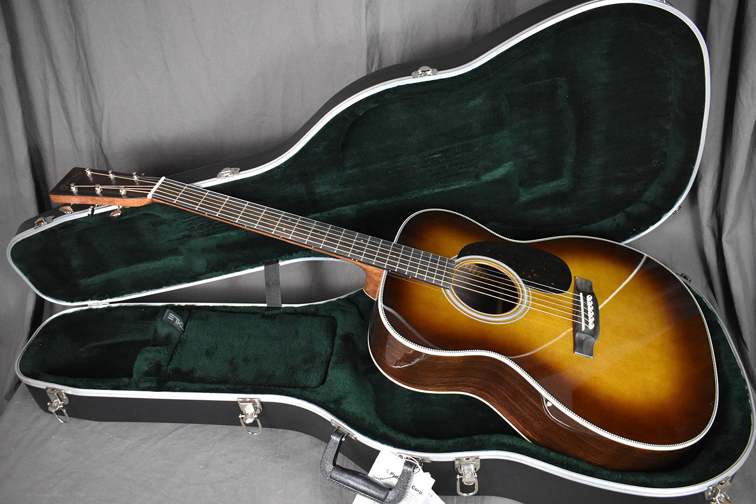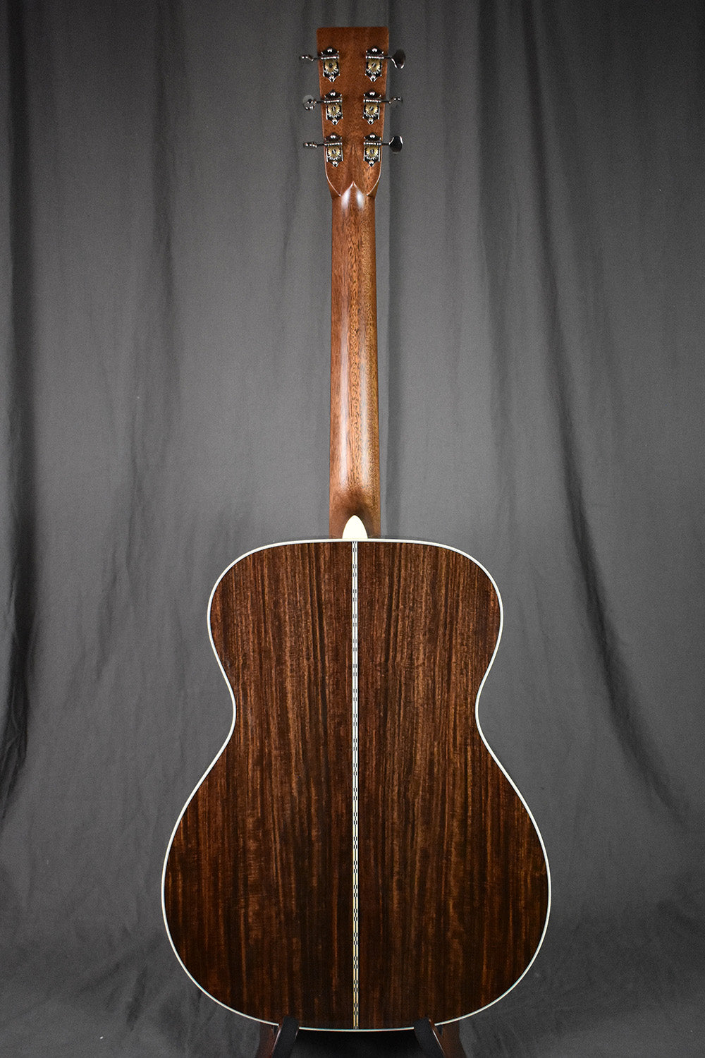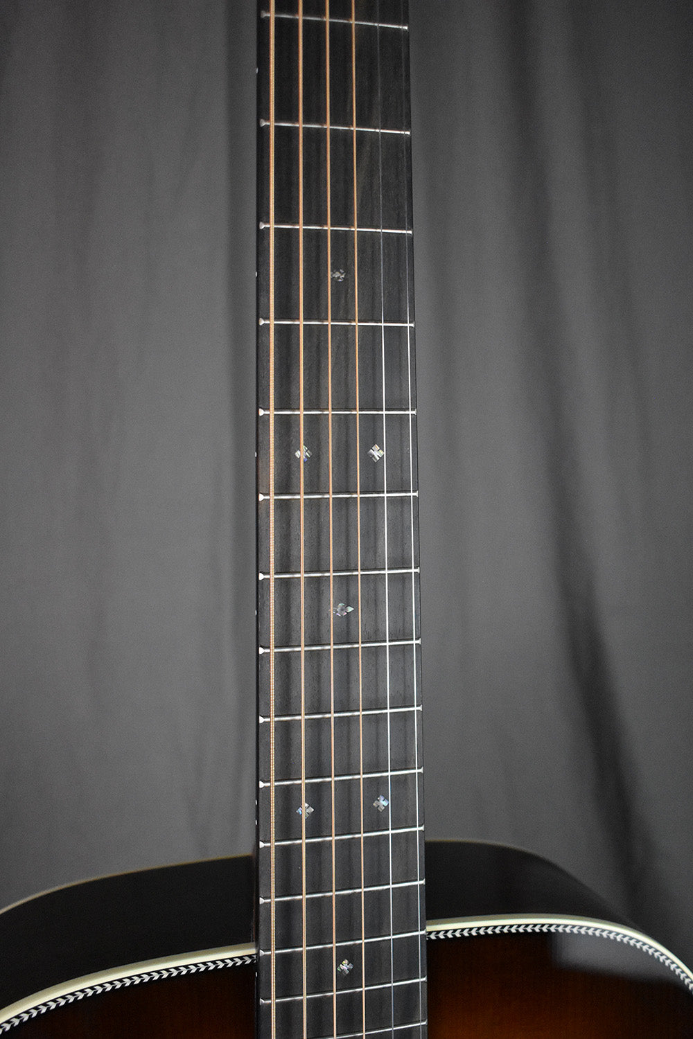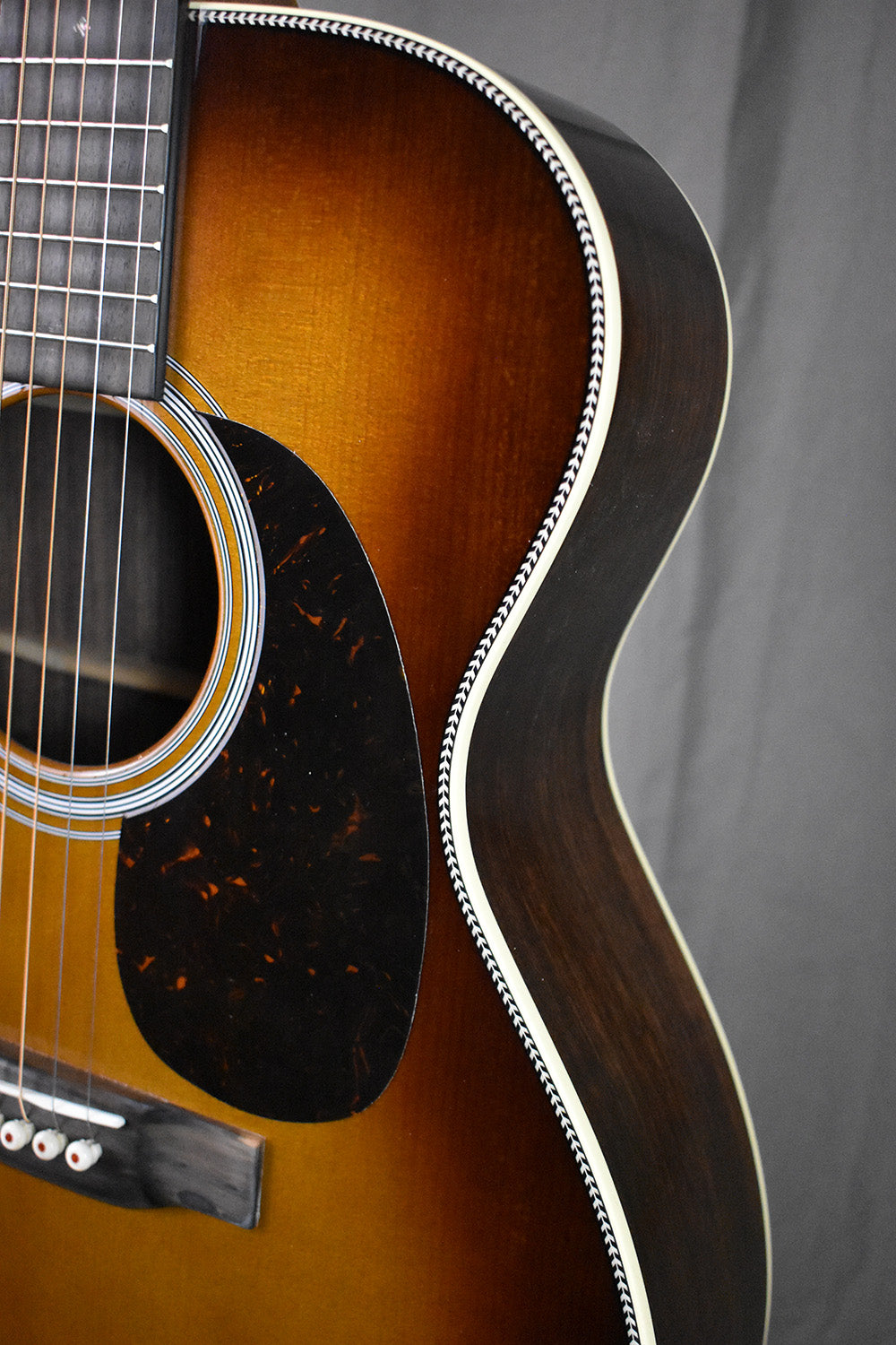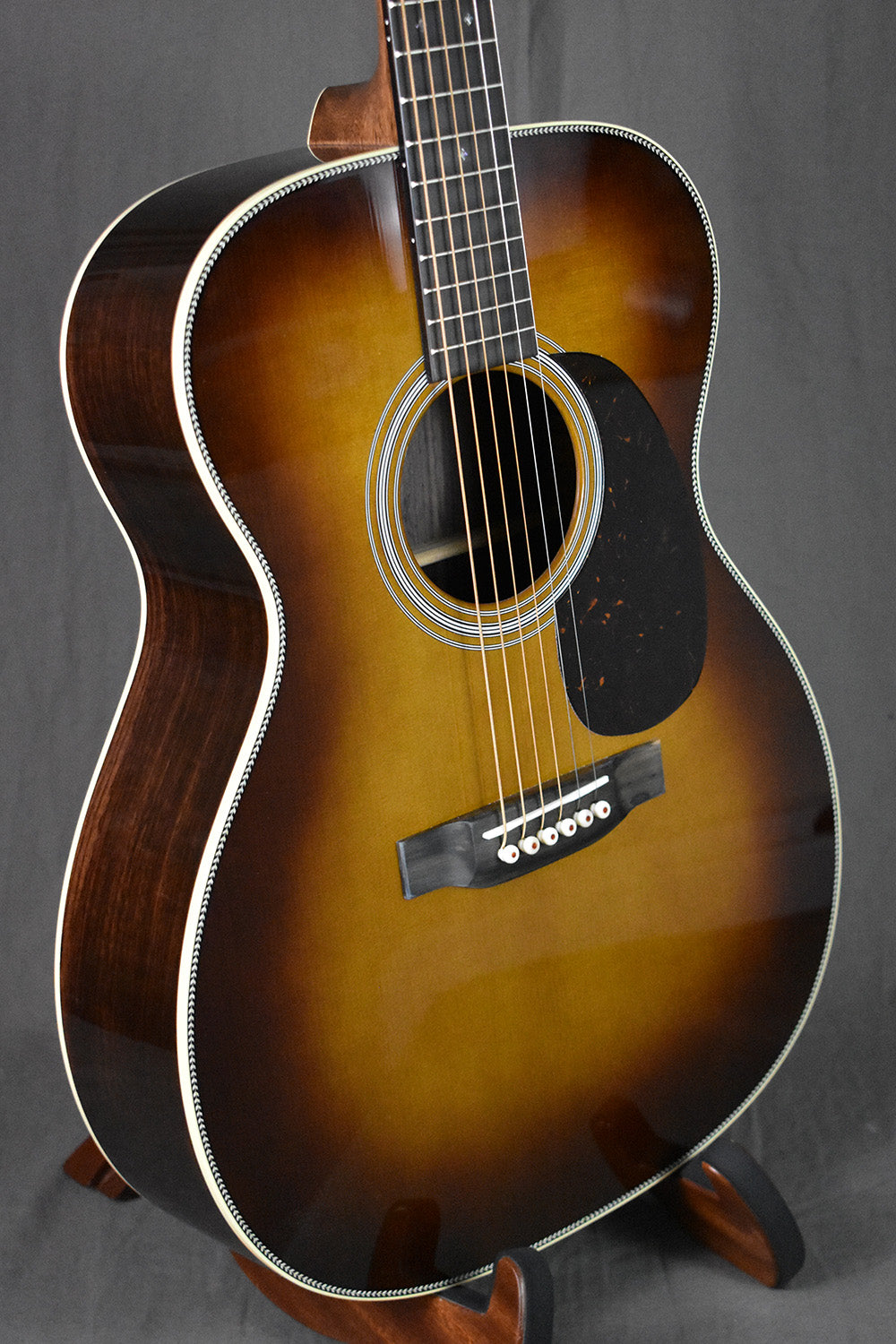 The construction of the 000-28 is straightforward: 14-fret 000 body, 24.9" scale, Spruce top, and East Indian Rosewood back and sides. It produces a warm sound with well-defined bass and shimmering trebles. The short scale makes the 000-28 a great fit for fingerpickers, but it still sounds great with a pick. This Standard Series 000-28 features an Ambertone Sunburst finish that was inspired by the 1933 Shade Top relics held in the Martin Museum in Nazareth.
