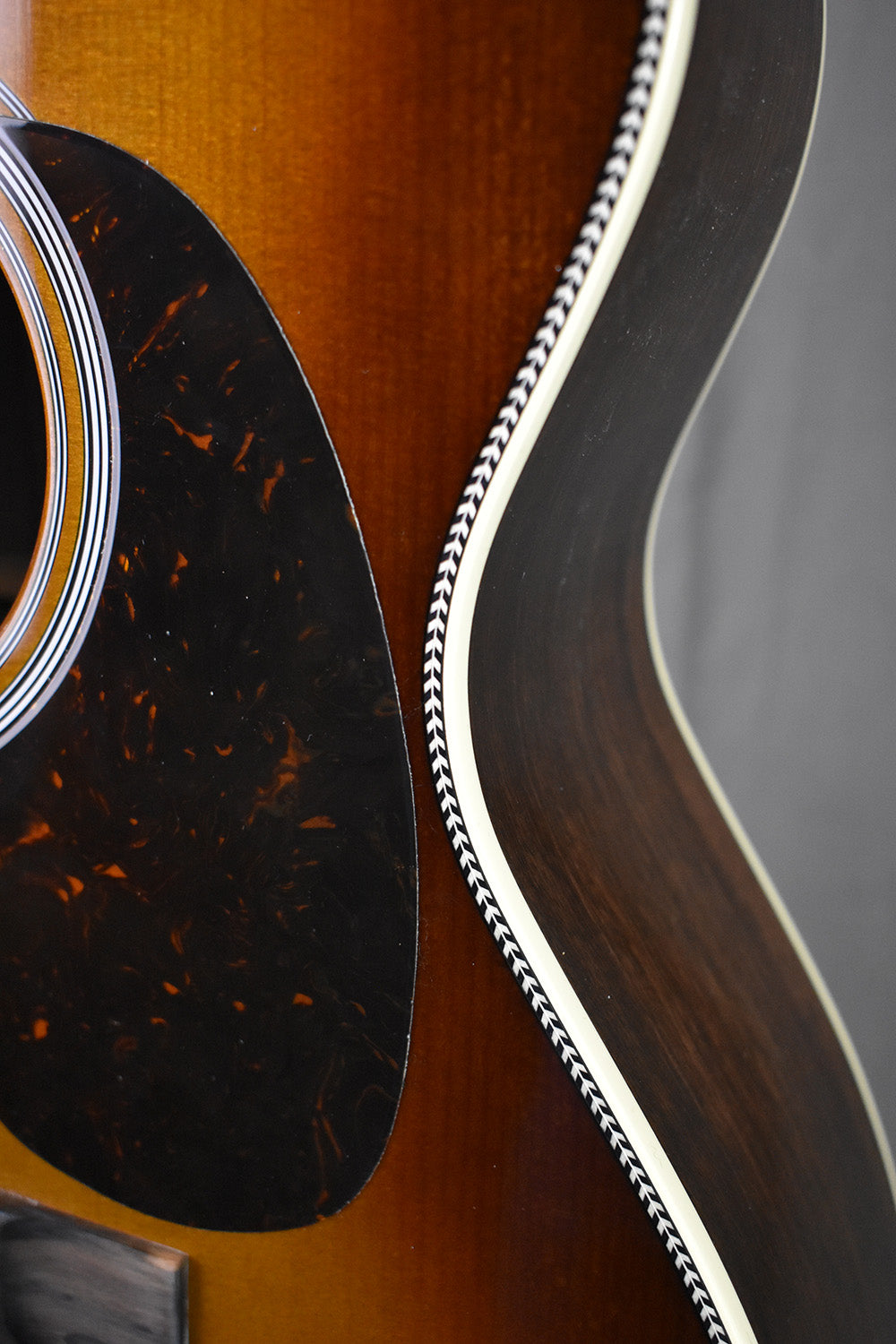 Refreshed for 2025 with Golden Era specs to enhance tone, comfort, and style, the 000-28 now has the same spruce GE top bracing you find on the Modern Deluxe Series, which helps the model deliver vintage-inspired tone and sustain. Updates like a reimagined neck profile, thinner fingerboard, and refined bridge and heel improve playability and aesthetics. The result is quick response, a balanced sound with plenty of bass, and impressive volume with a lighter touch. As for appointments, the classic Style-28 details—such as Herringbone trim—add elegance without going over the top.