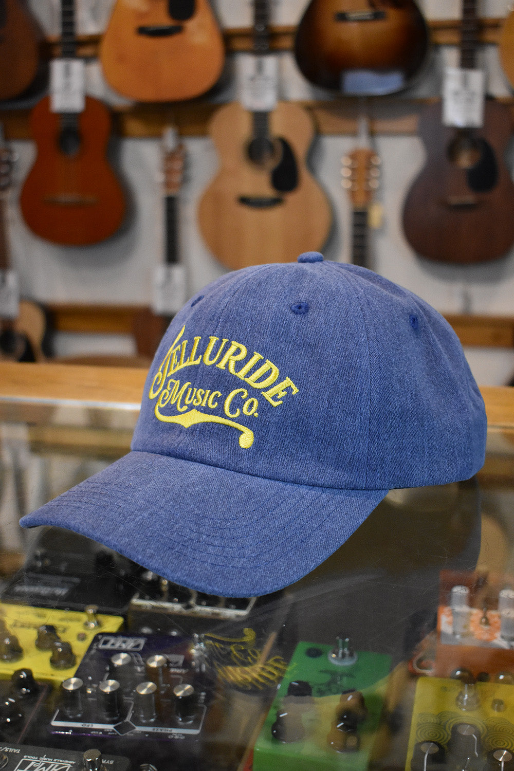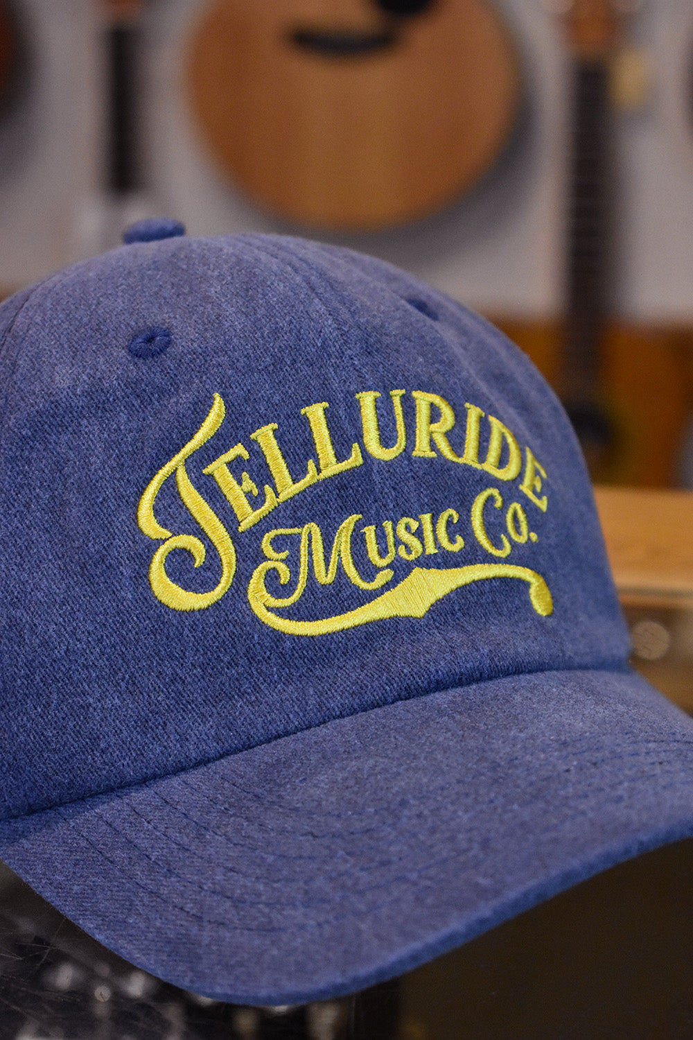 Featuring "Telluride Music Co." proudly embroidered in Yellow, this Limited Edition hat features a Navy washed-cotton design with a bent bill. Baseball slider adjustment. One size fits most, and your dad is going to love it.