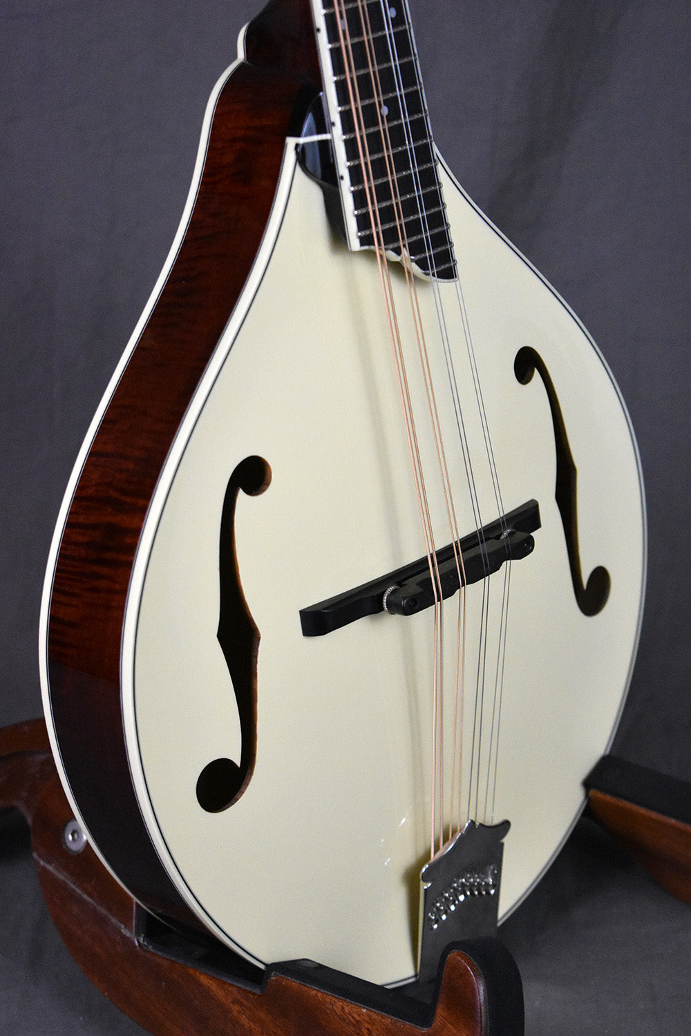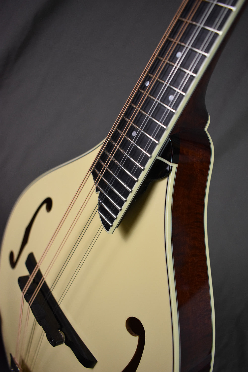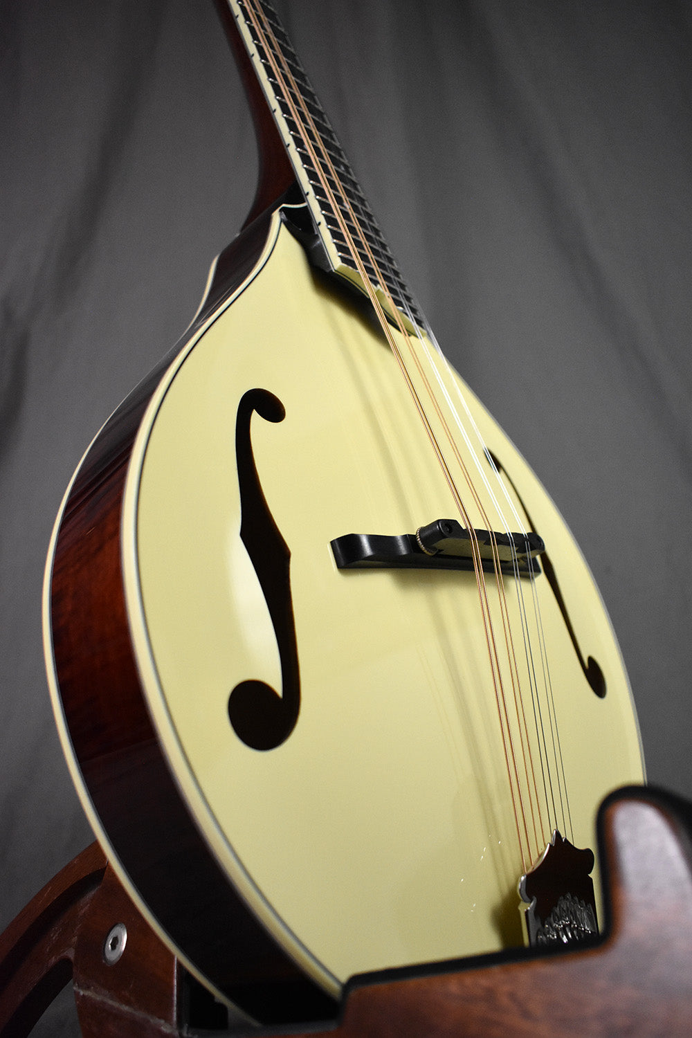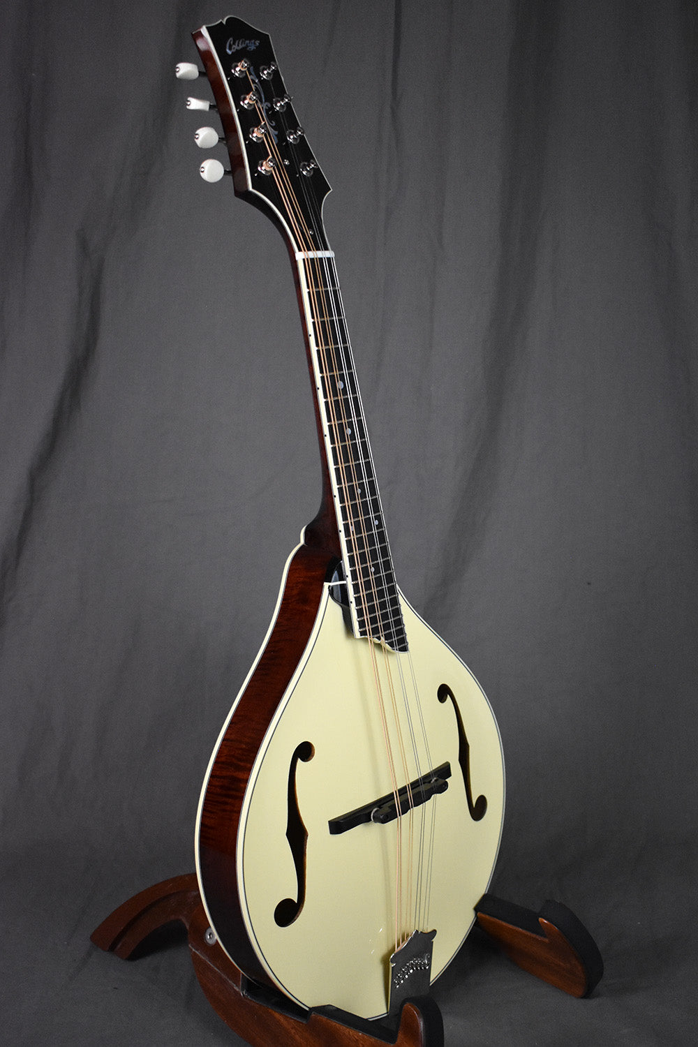 The MT2 is Collings' deluxe A-model, so it boasts elegant appointments, such as a Flourish peghead inlay, a high-gloss finish, and fancy binding around the edges. We ordered this one with a Cream Top finish and Red Stain back, sides, and neck. This is an elegant, high-end mandolin.