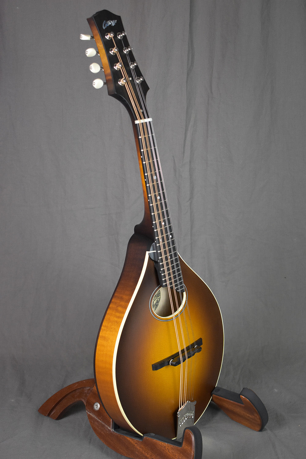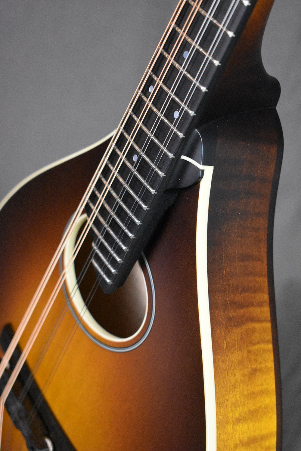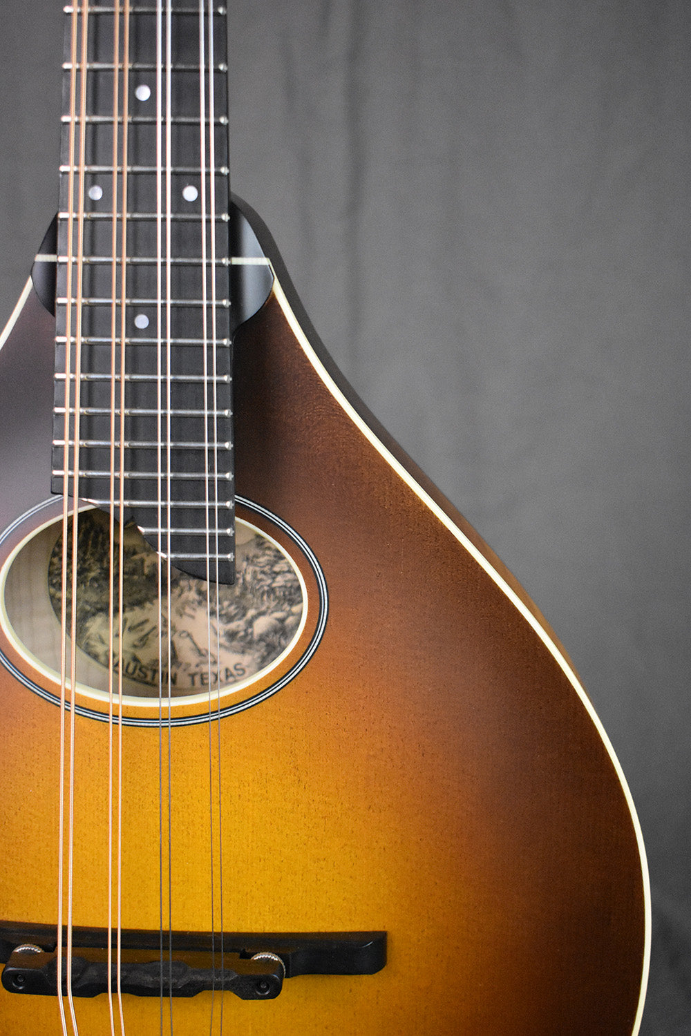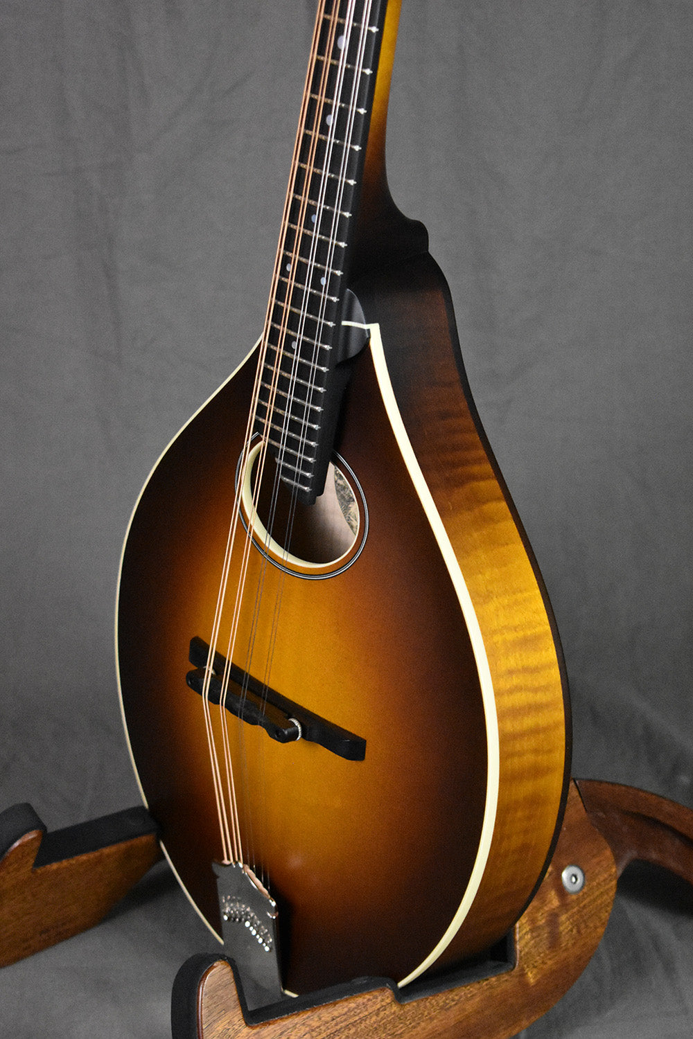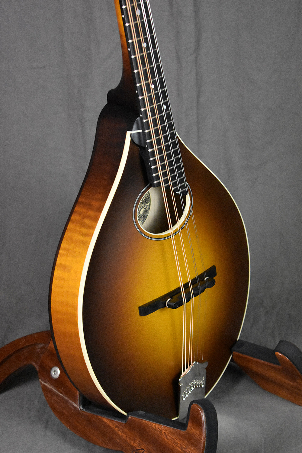This Collings MT O (serial #A4725) sports a gorgeous satin sunburst with upgraded Ivoroid binding around the top and edge of the oval soundhole. It produces a warm, open sound that accompanies voice better than an f-hole mandolin. A perfect fit for old-time and traditional styles, the oval soundhole shines for folk accompaniment or anything where a richer, warmer sound is desired. Way more range a simple bluegrass instrument, this is an impressive mandolin from an impressive builder at the top of their game.