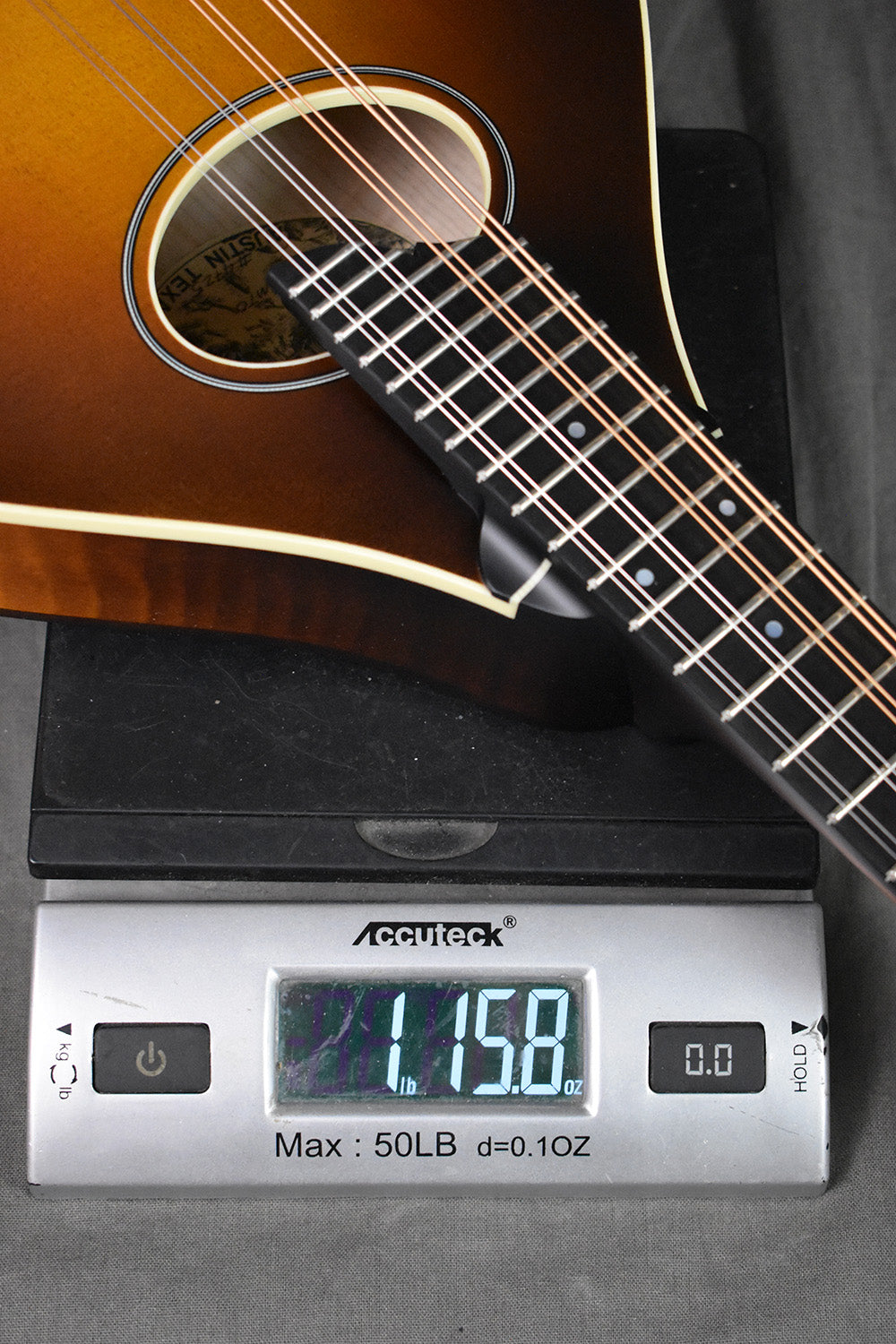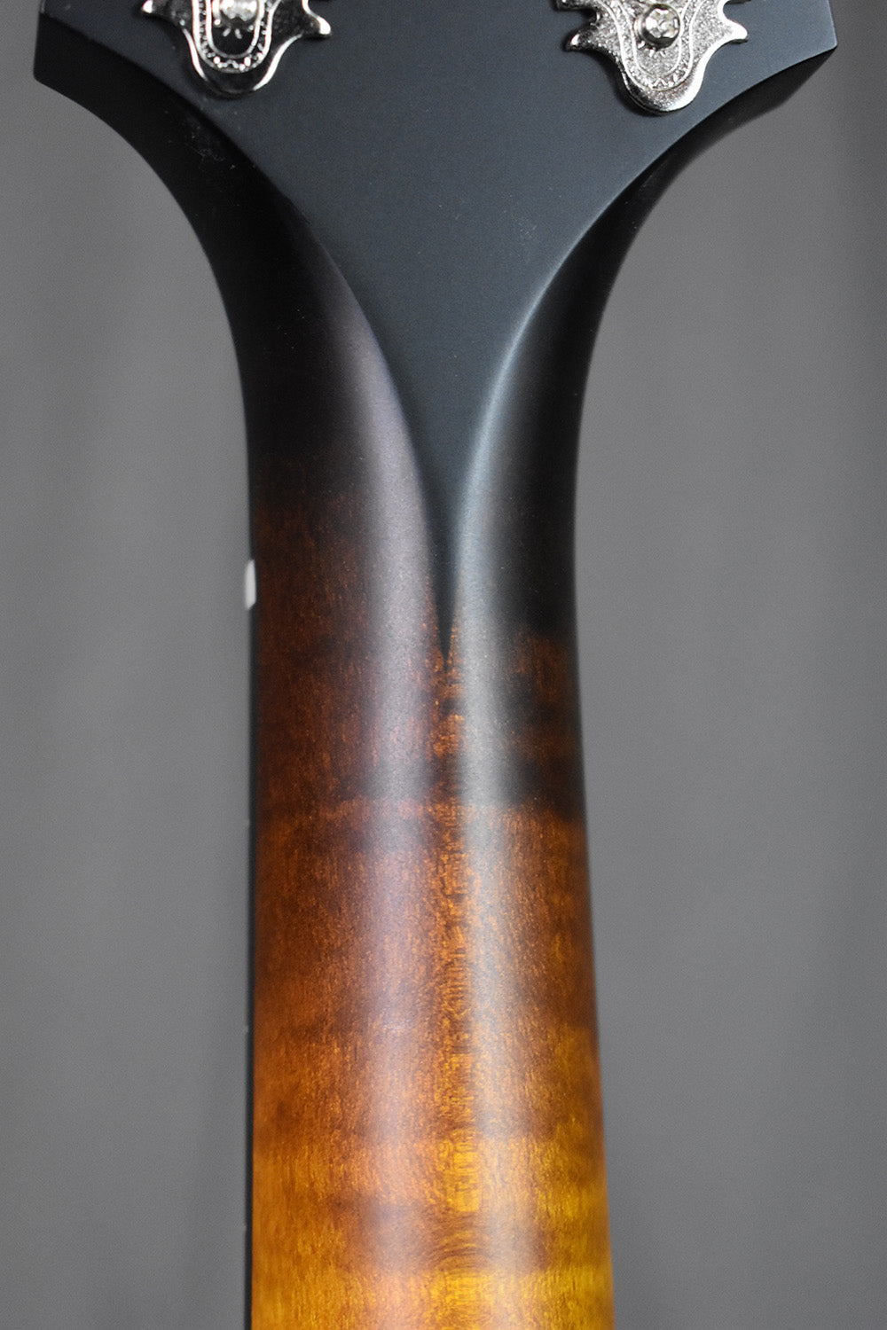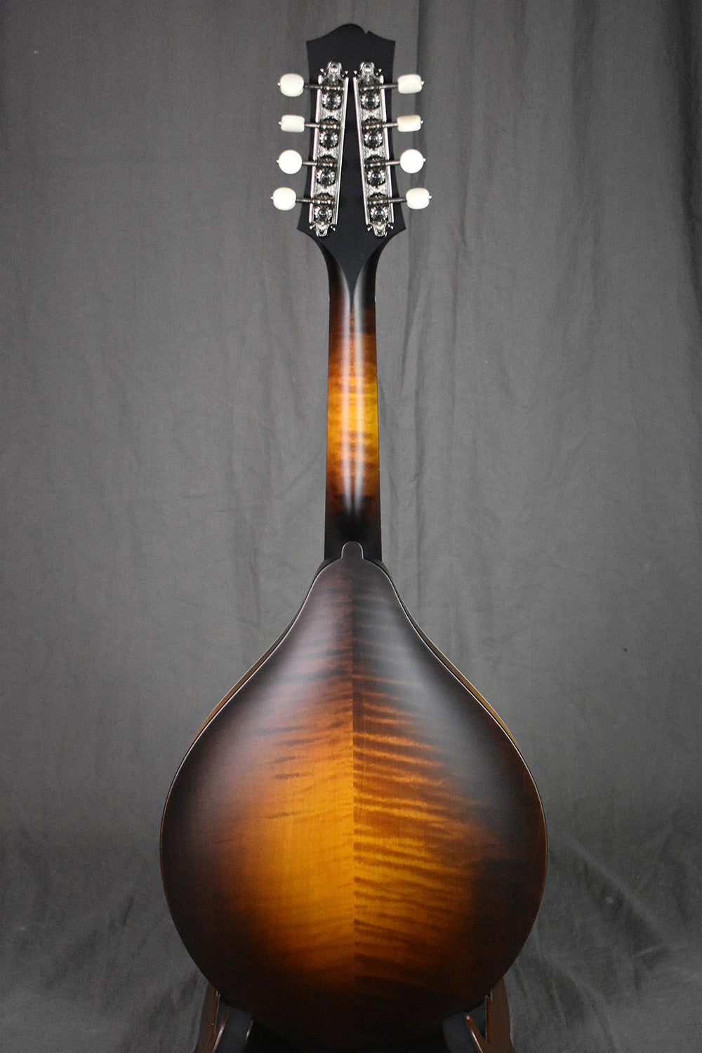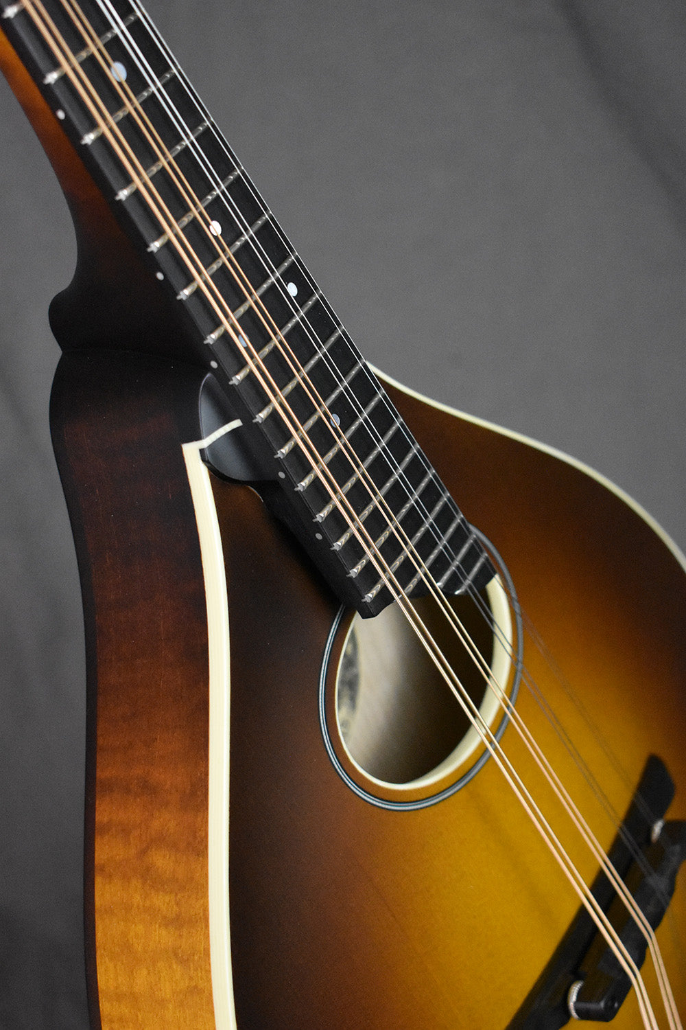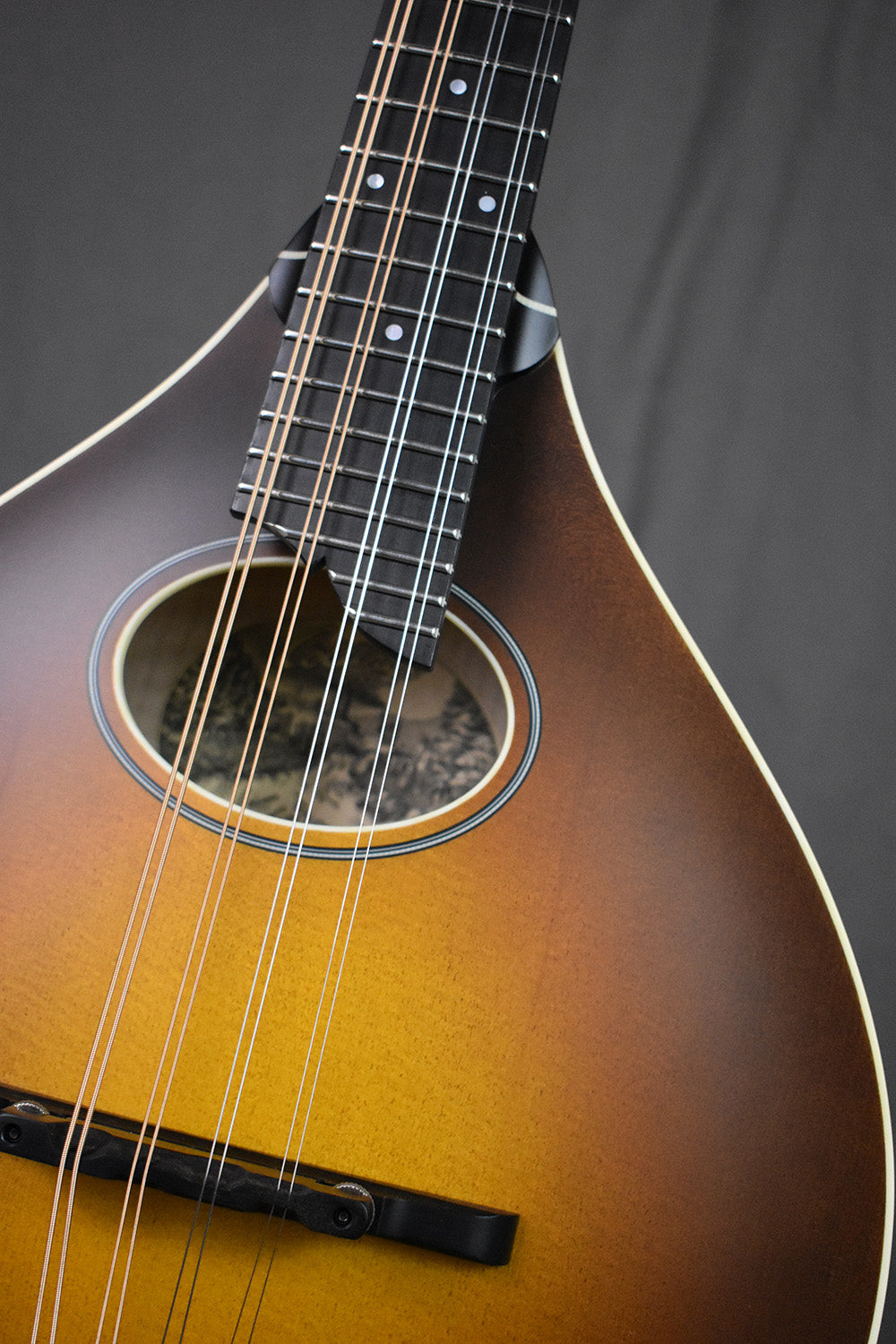This Collings MT O (serial #A4725) sports a gorgeous satin sunburst with upgraded Ivoroid binding around the top and edge of the oval soundhole. It produces a warm, open sound that accompanies voice better than an f-hole mandolin. A perfect fit for old-time and traditional styles, the oval soundhole shines for folk accompaniment or anything where a richer, warmer sound is desired. Way more range a simple bluegrass instrument, this is an impressive mandolin from an impressive builder at the top of their game.