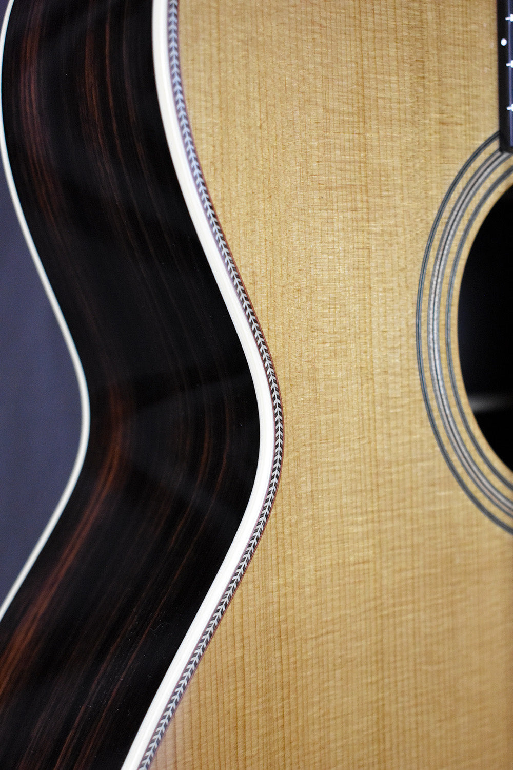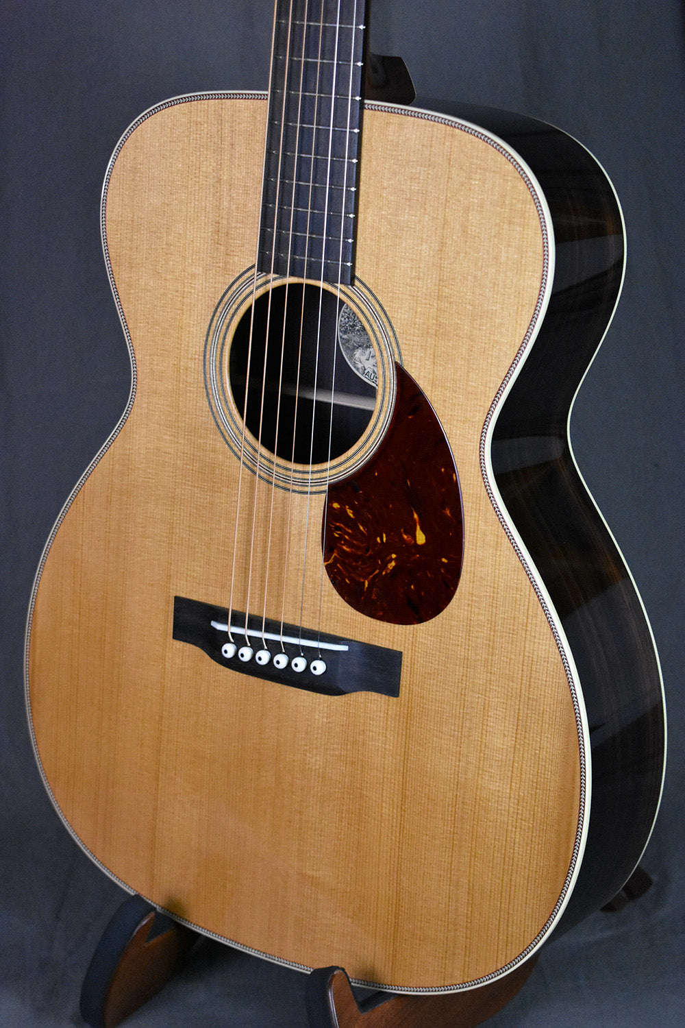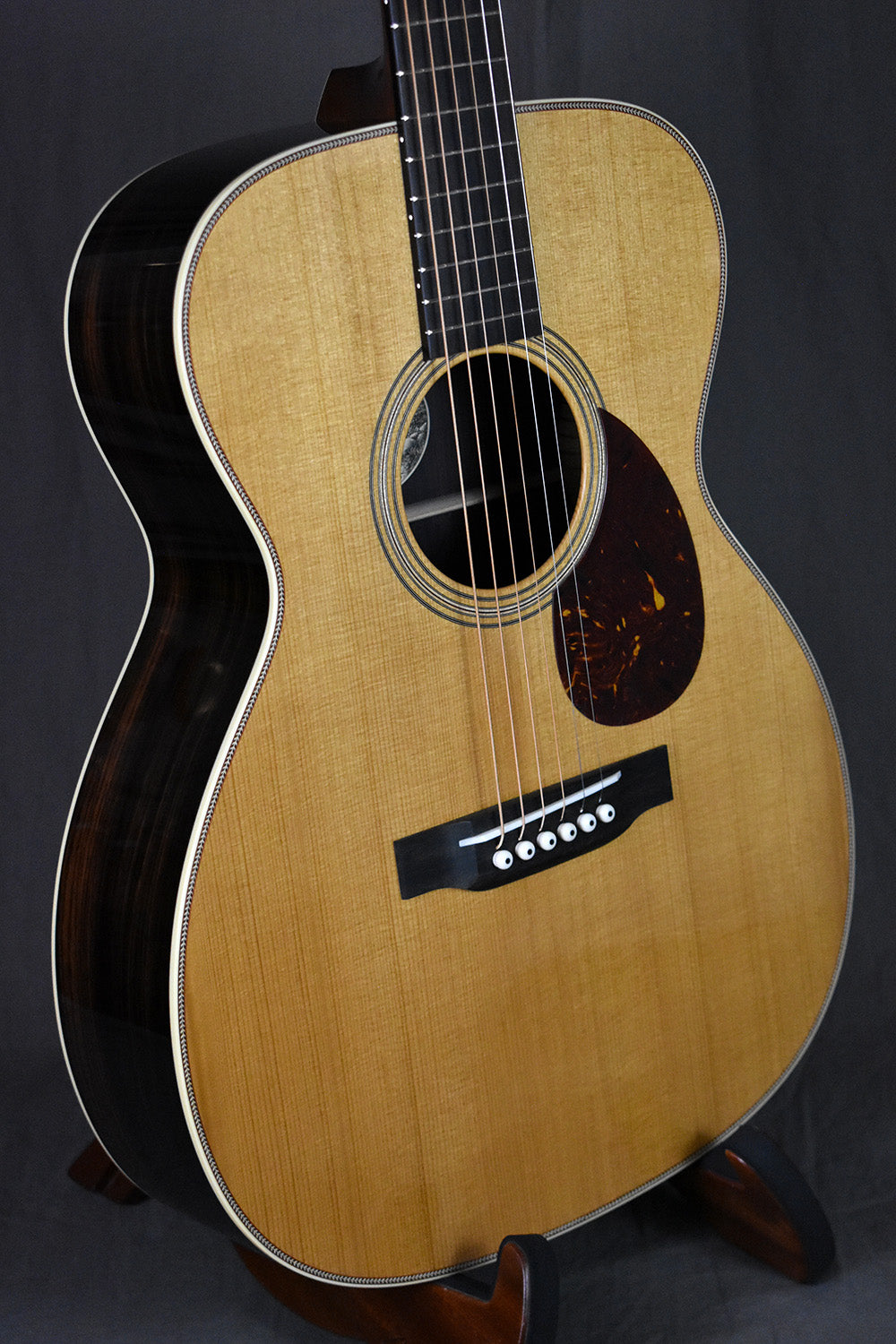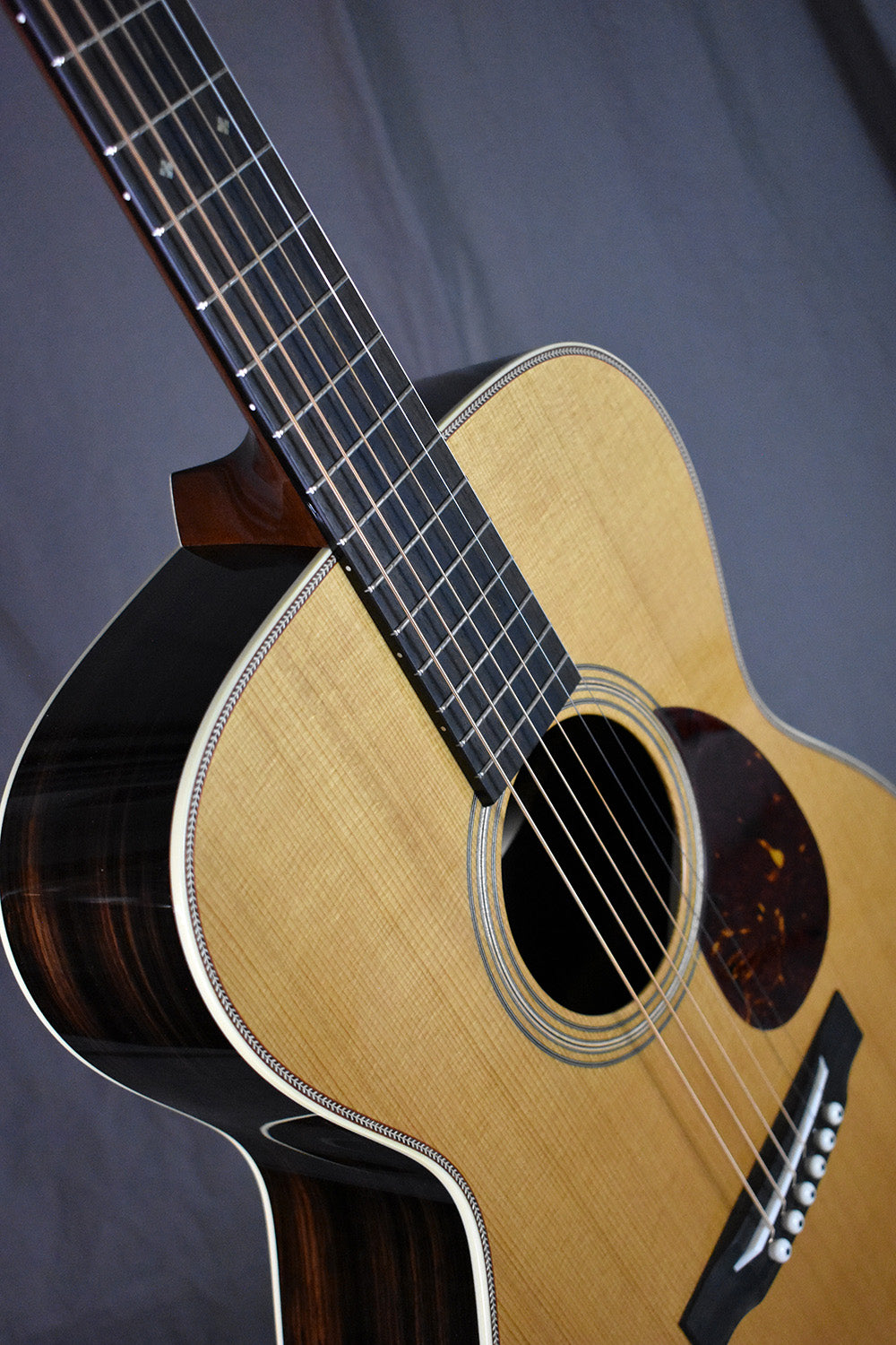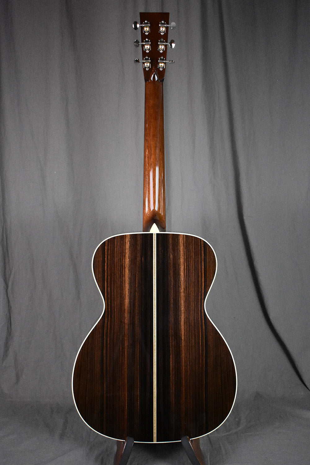 This OM2H A T (serial #36300) represents the Orchestra Model platform within the Traditional Series and features an upgraded Baked Adirondack Spruce top. The torrefied top delivers the openness and dryness of a well-played vintage instrument from day one, along with a slightly darker, aged appearance. In the OM body, that responsiveness translates to remarkable range: it has the headroom and projection to handle assertive flatpicking, while retaining the balance, clarity, and dynamic sensitivity fingerstyle players rely on. Notes stay defined under a heavy right hand, yet remain nuanced and articulate when played lightly—making this an especially versatile choice for players who move between styles.