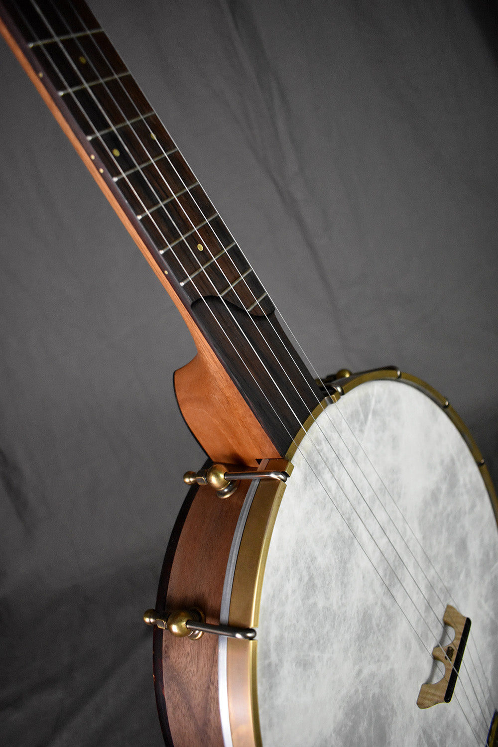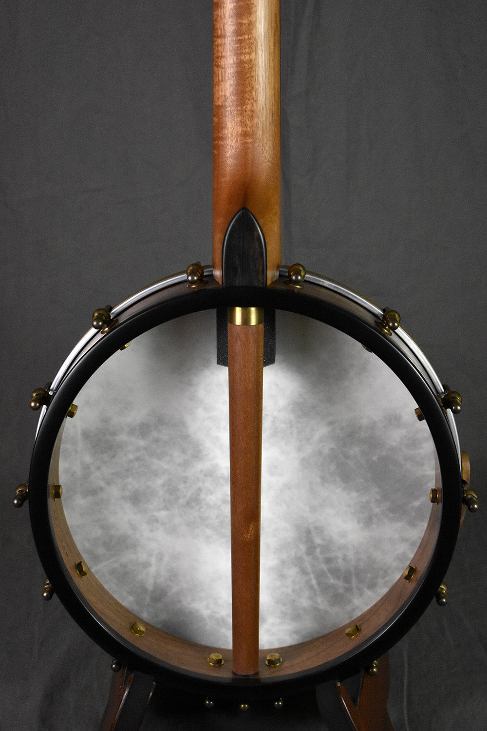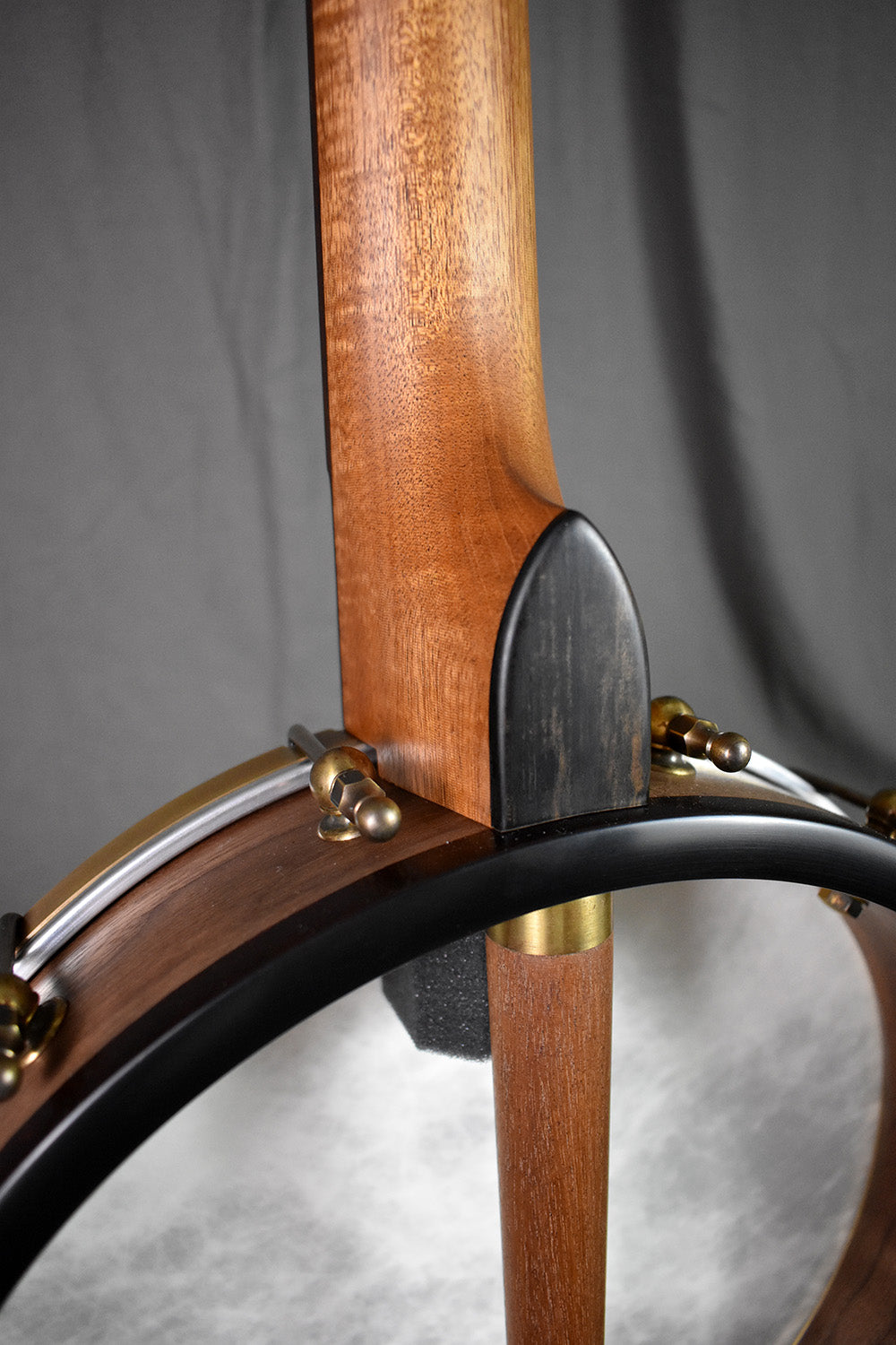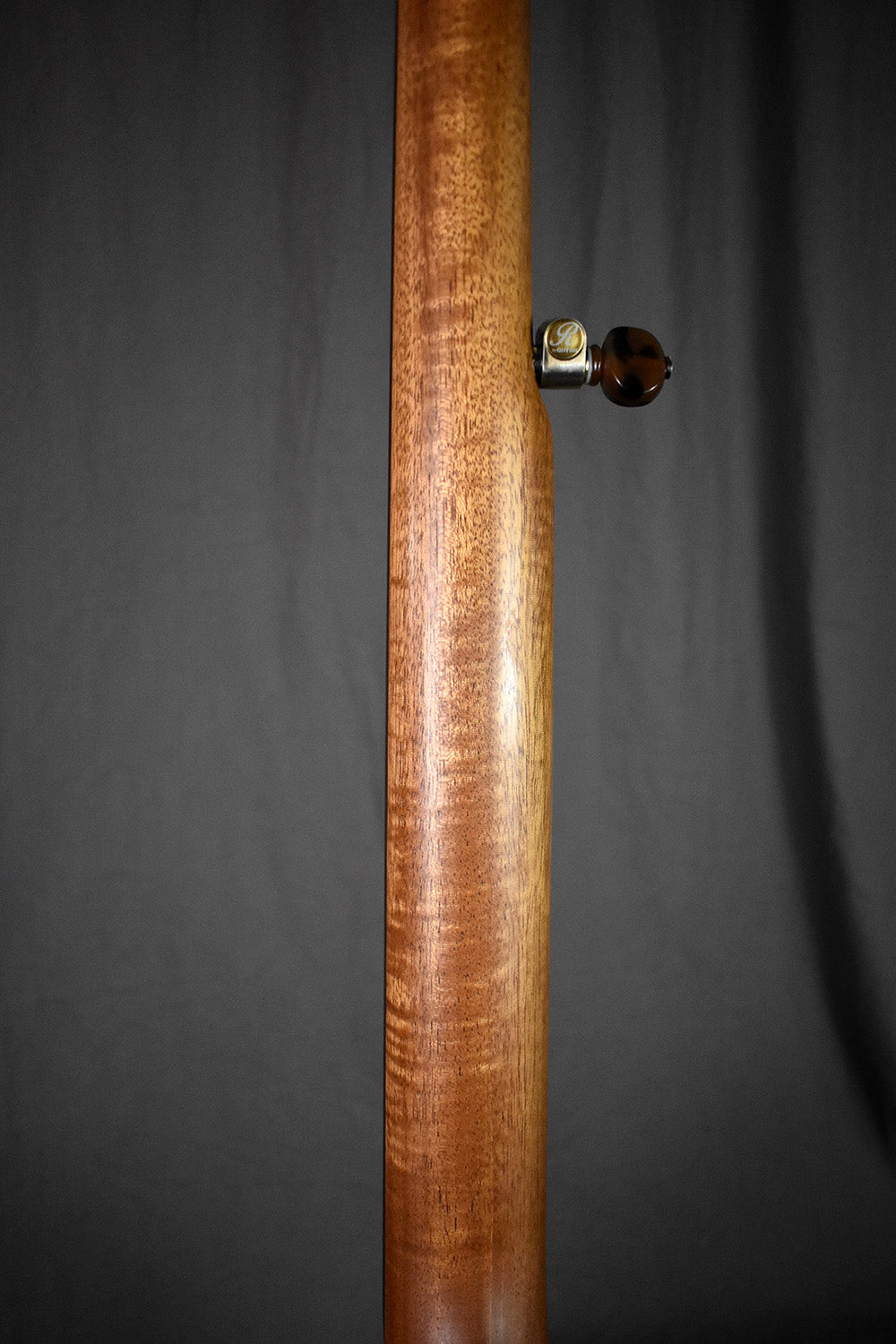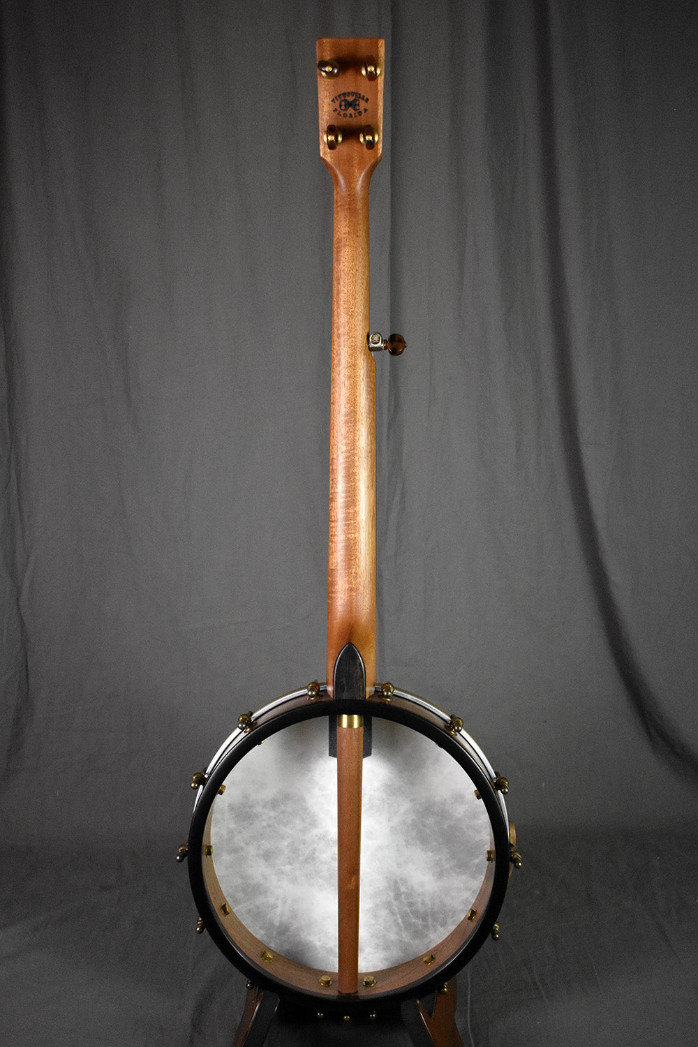 We ordered this Tupelo with a hand-carved Mahogany neck that a smooth tung oil finish for comfort and understated elegance. It has an ebony fingerboard with 17 hardened nickel frets, brass dot inlays, and a scoop to facility old-time and clawhammer styles. The paddle-style headstock with ebony tuner buttons and Rickard Cyclone tuners adds a touch of refined craftsmanship, echoing the banjo’s timeless aesthetic.