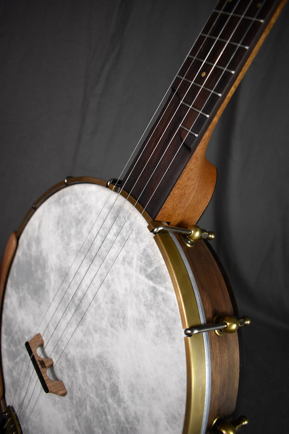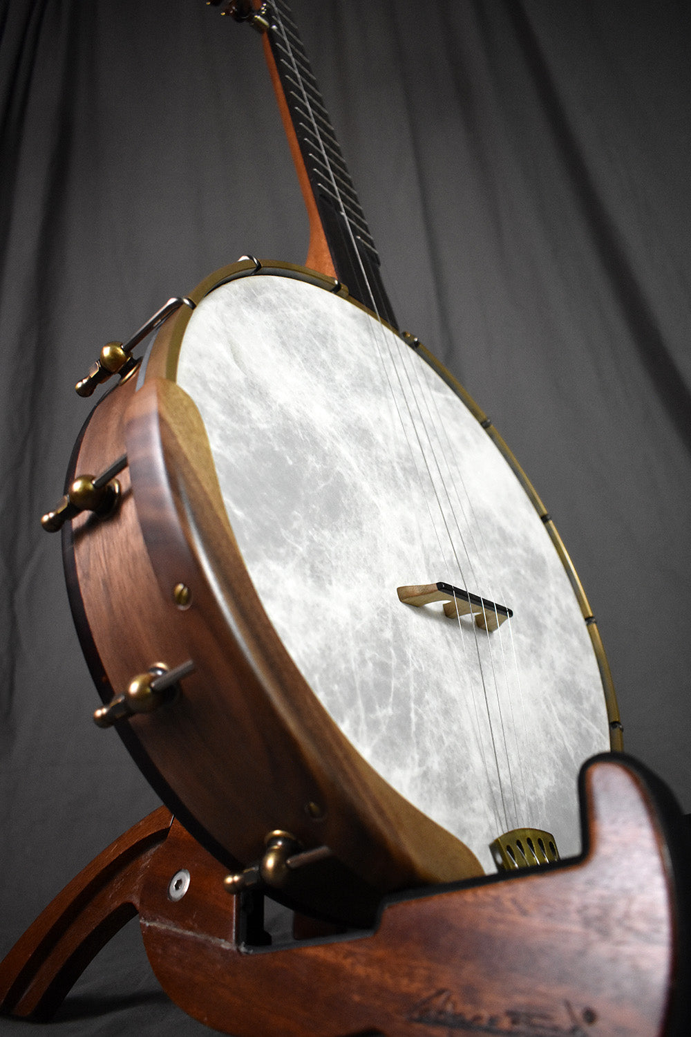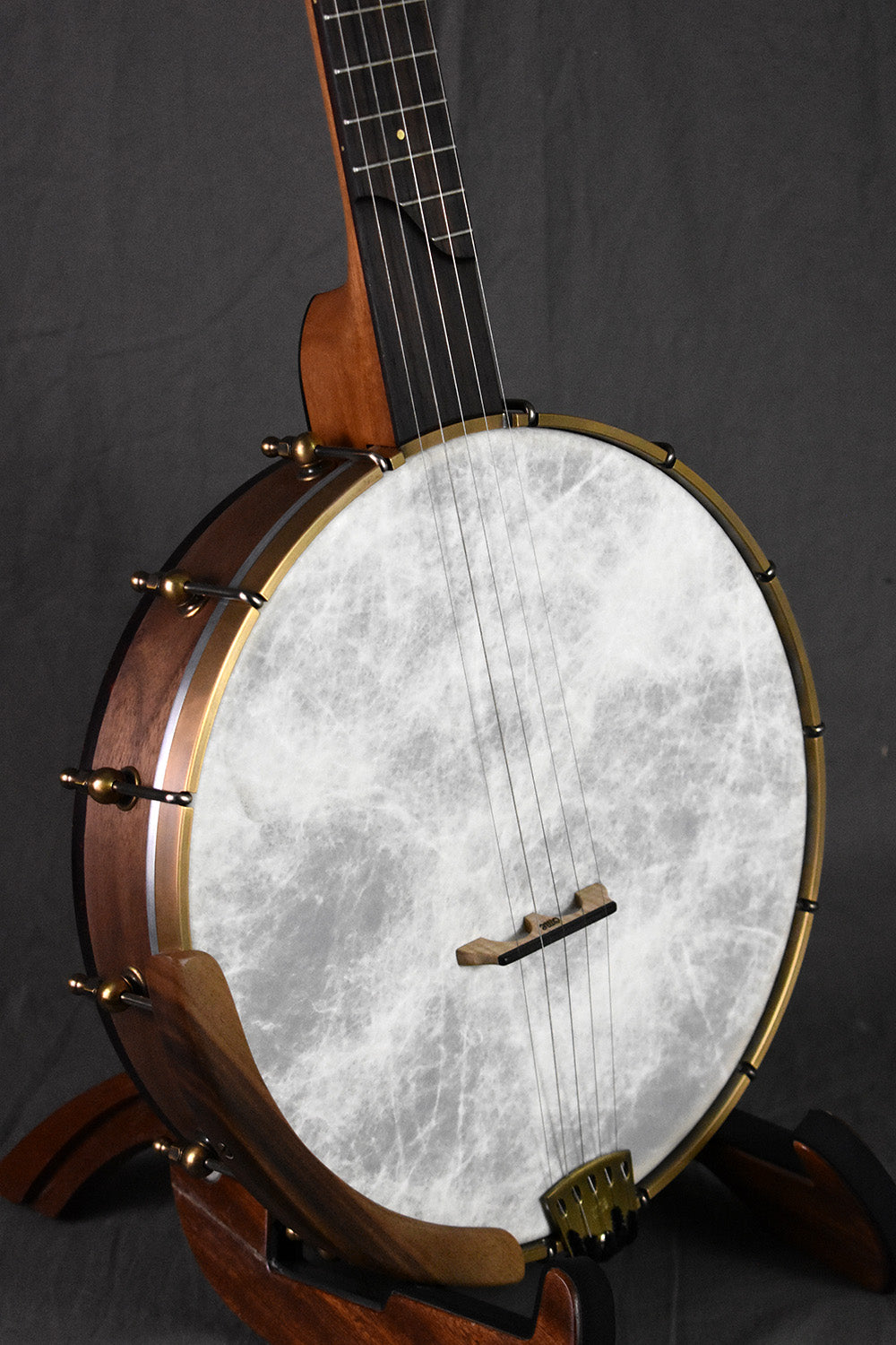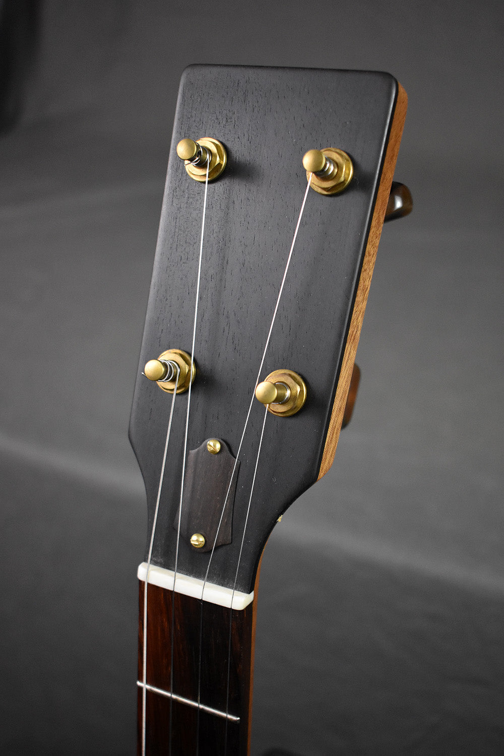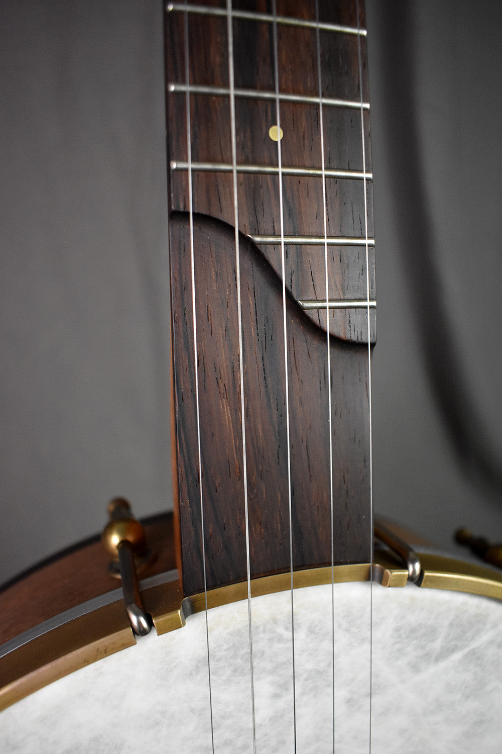 We ordered this Tupelo with a hand-carved Mahogany neck that a smooth tung oil finish for comfort and understated elegance. It has an ebony fingerboard with 17 hardened nickel frets, brass dot inlays, and a scoop to facility old-time and clawhammer styles. The paddle-style headstock with ebony tuner buttons and Rickard Cyclone tuners adds a touch of refined craftsmanship, echoing the banjo’s timeless aesthetic.