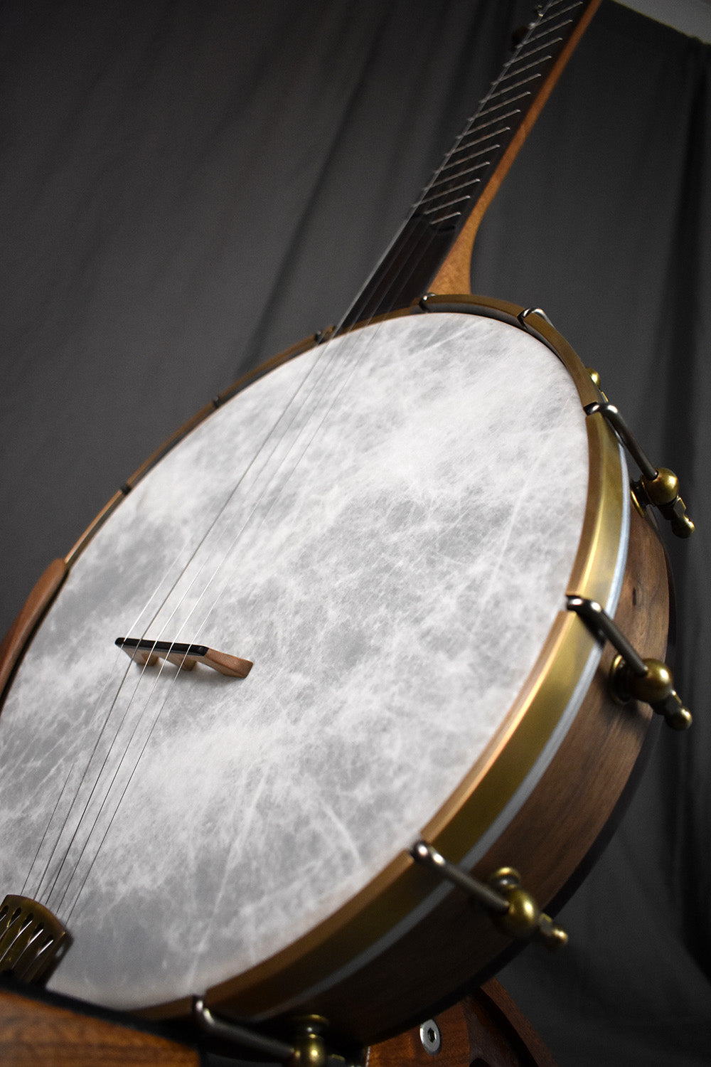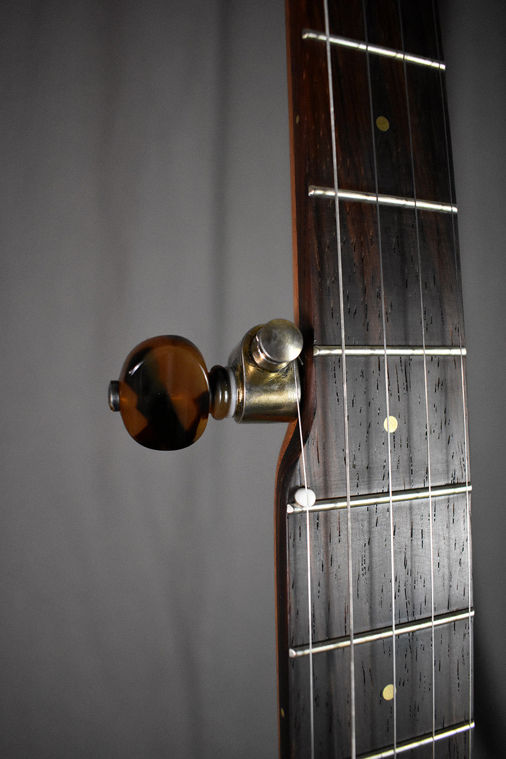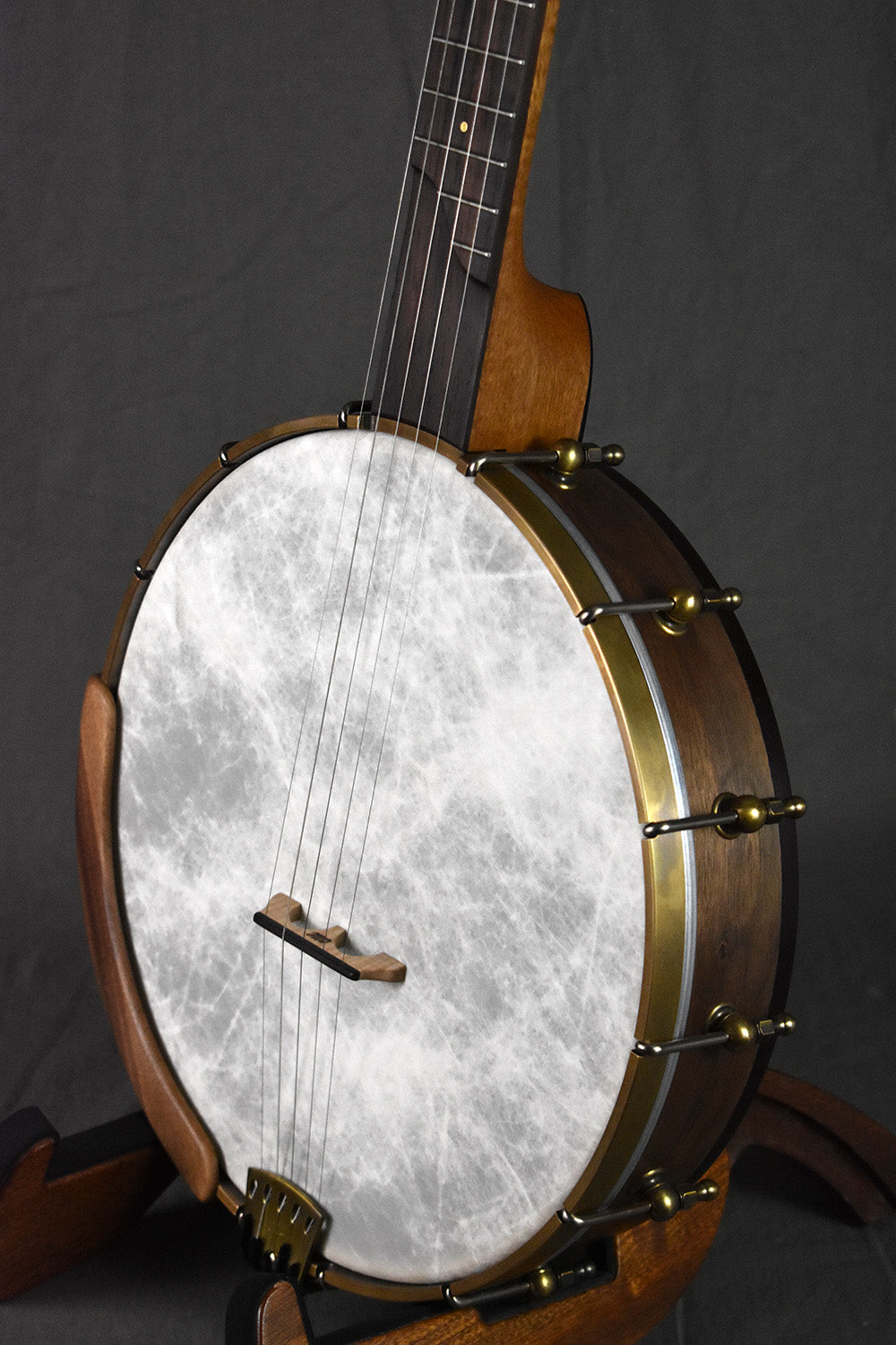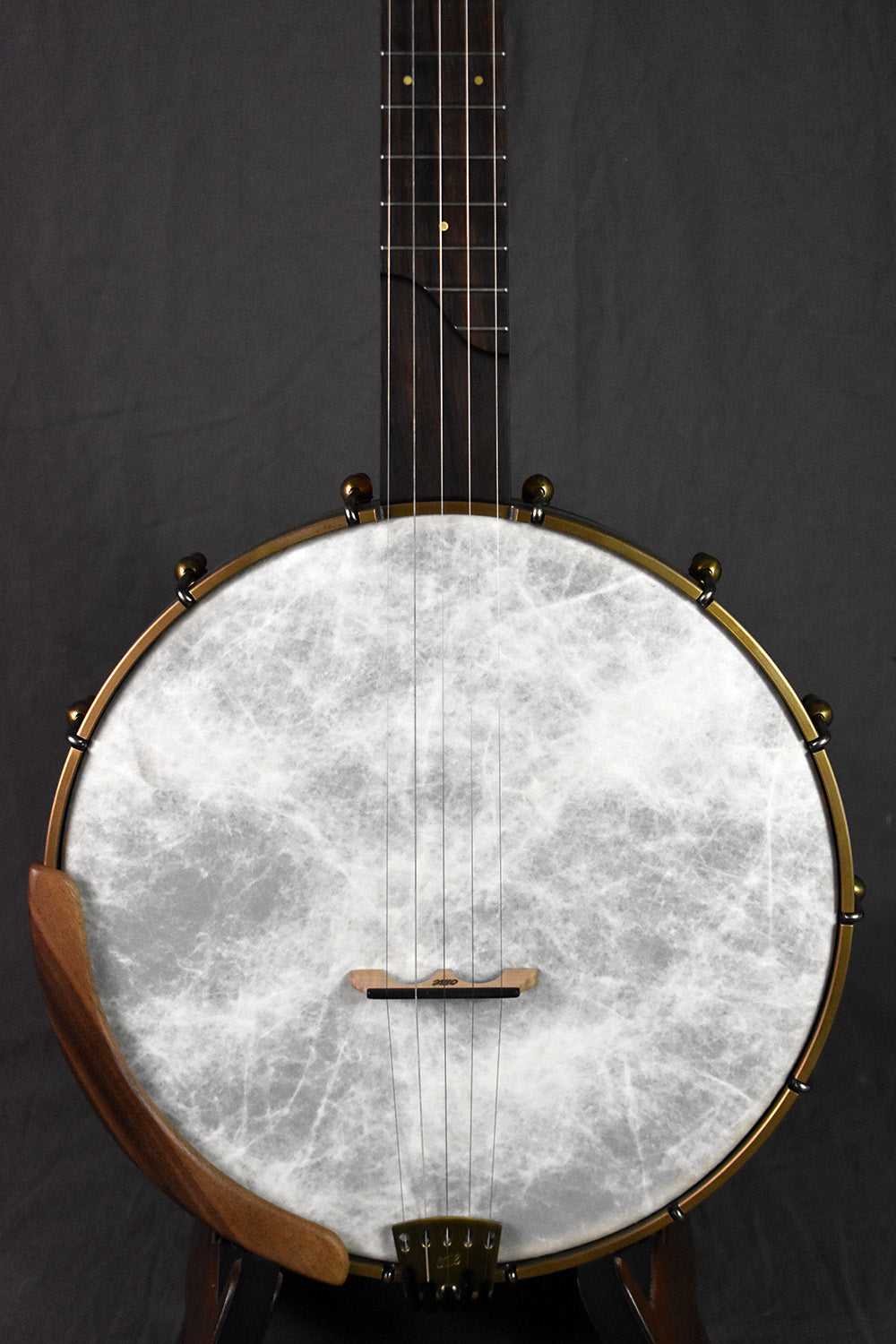 We ordered this Tupelo with a hand-carved Mahogany neck that a smooth tung oil finish for comfort and understated elegance. It has an ebony fingerboard with 17 hardened nickel frets, brass dot inlays, and a scoop to facility old-time and clawhammer styles. The paddle-style headstock with ebony tuner buttons and Rickard Cyclone tuners adds a touch of refined craftsmanship, echoing the banjo’s timeless aesthetic.