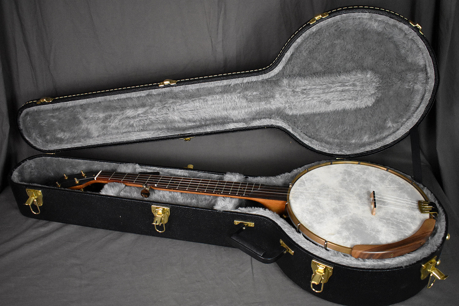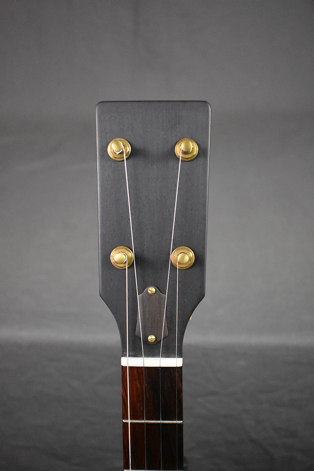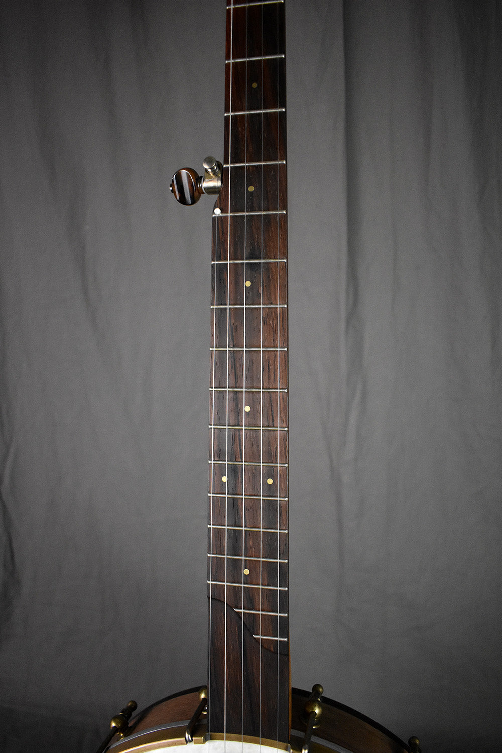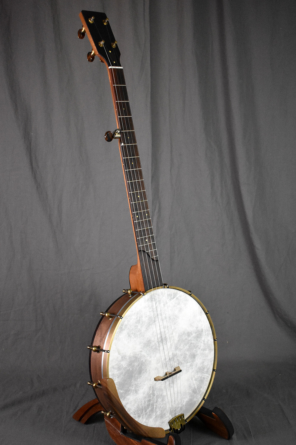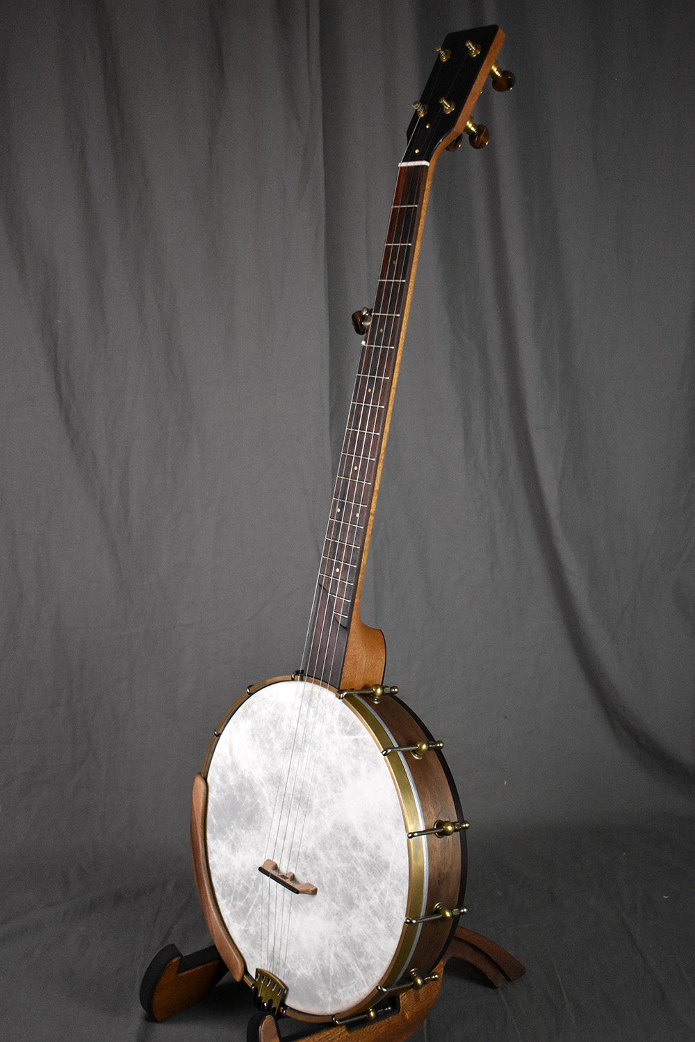 We ordered this Tupelo with a hand-carved Mahogany neck that a smooth tung oil finish for comfort and understated elegance. It has an ebony fingerboard with 17 hardened nickel frets, brass dot inlays, and a scoop to facility old-time and clawhammer styles. The paddle-style headstock with ebony tuner buttons and Rickard Cyclone tuners adds a touch of refined craftsmanship, echoing the banjo’s timeless aesthetic.