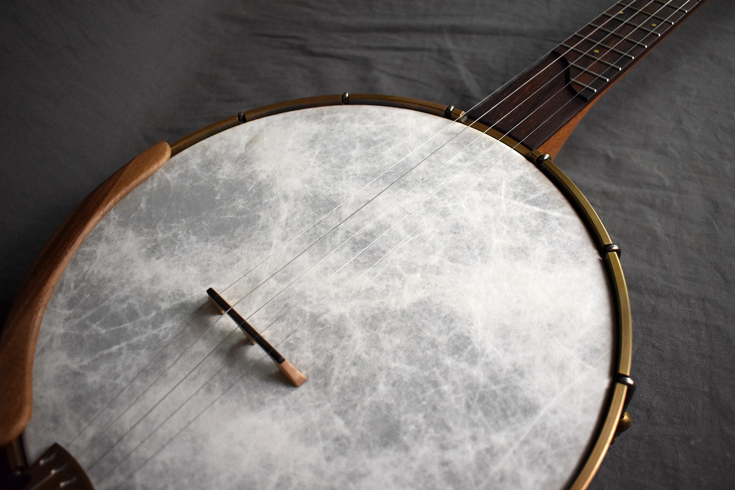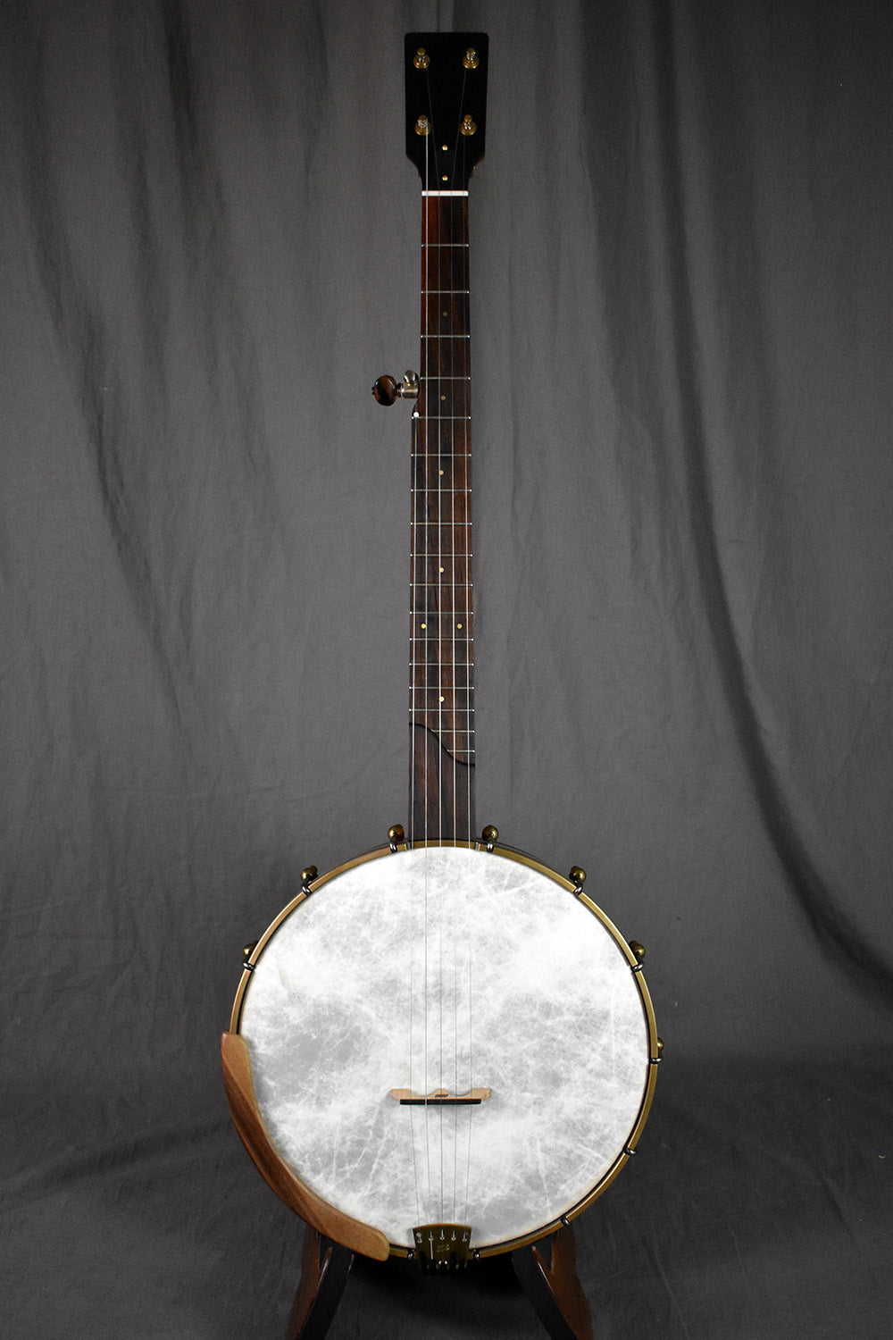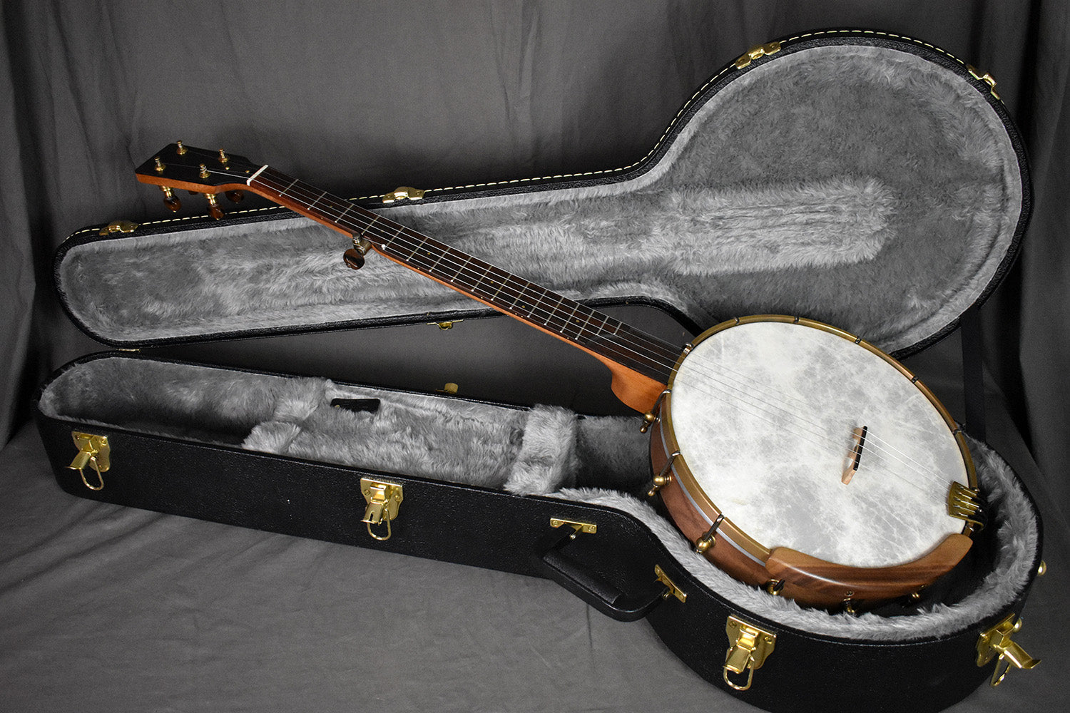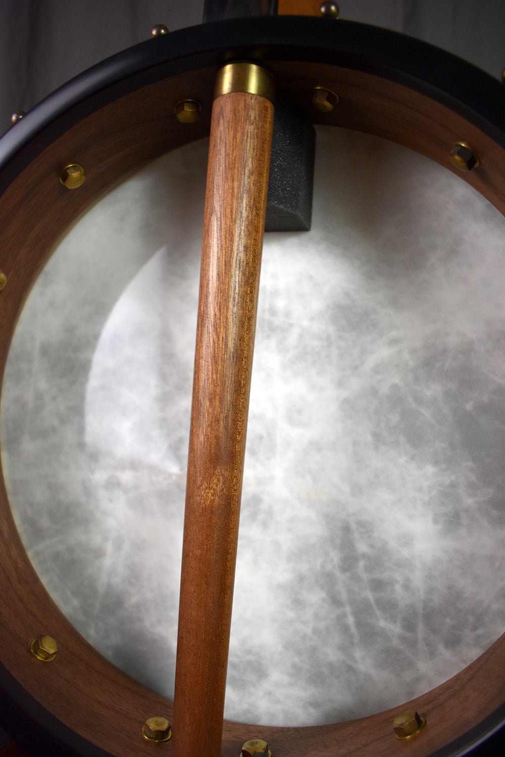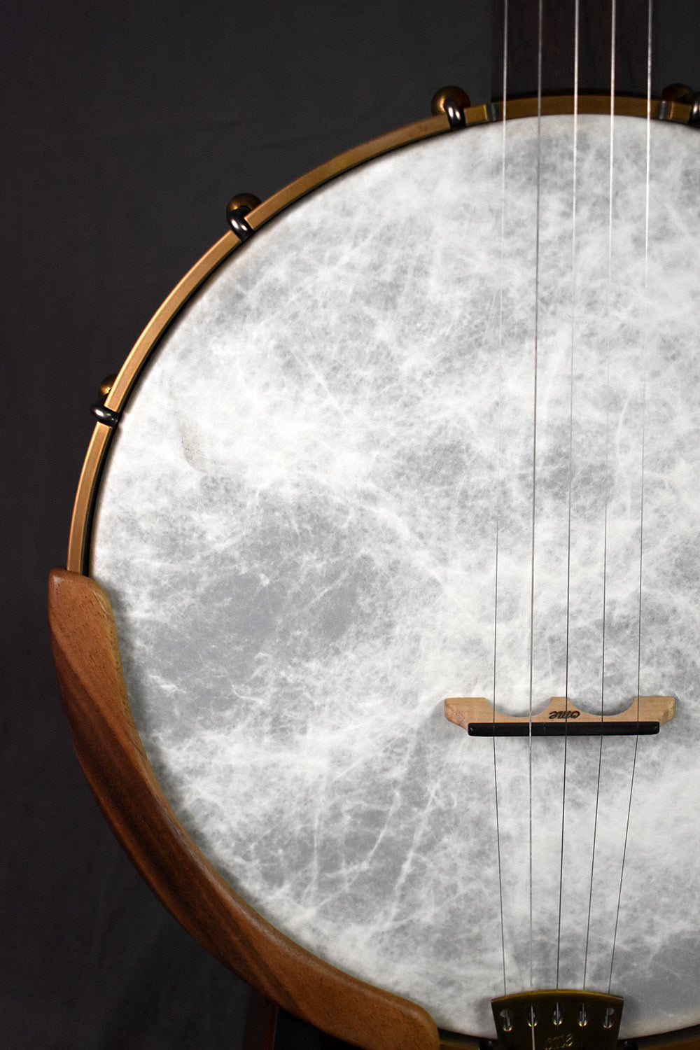 We ordered this Tupelo with a hand-carved Mahogany neck that a smooth tung oil finish for comfort and understated elegance. It has an ebony fingerboard with 17 hardened nickel frets, brass dot inlays, and a scoop to facility old-time and clawhammer styles. The paddle-style headstock with ebony tuner buttons and Rickard Cyclone tuners adds a touch of refined craftsmanship, echoing the banjo’s timeless aesthetic.