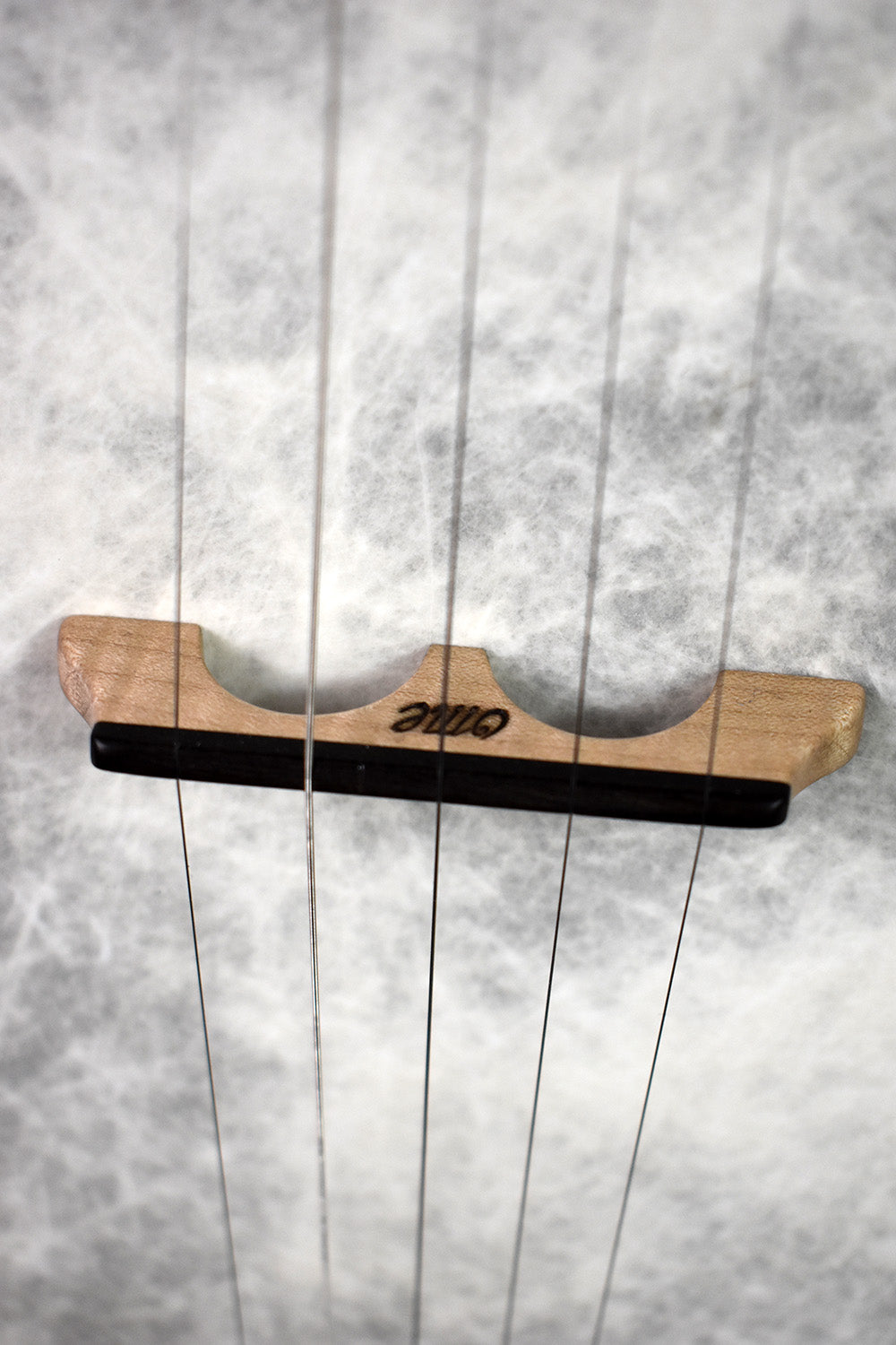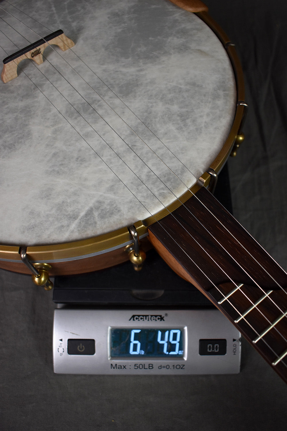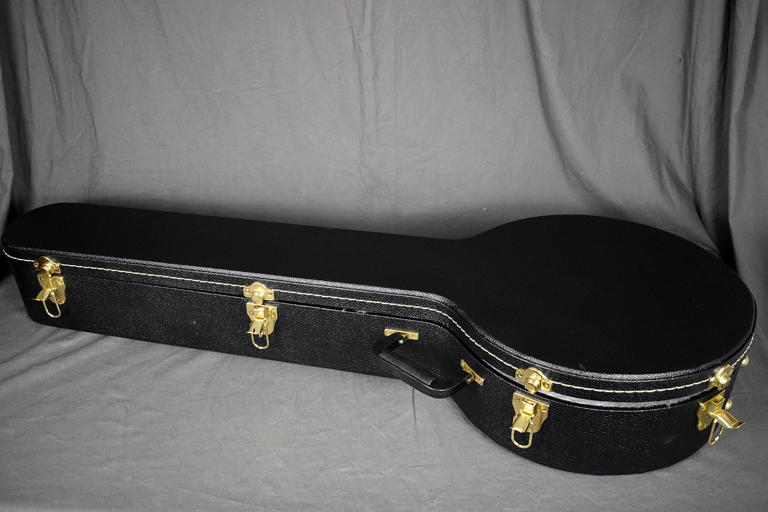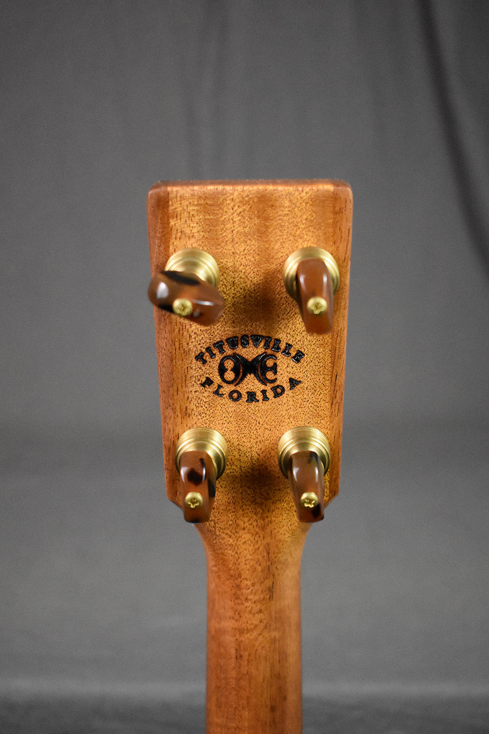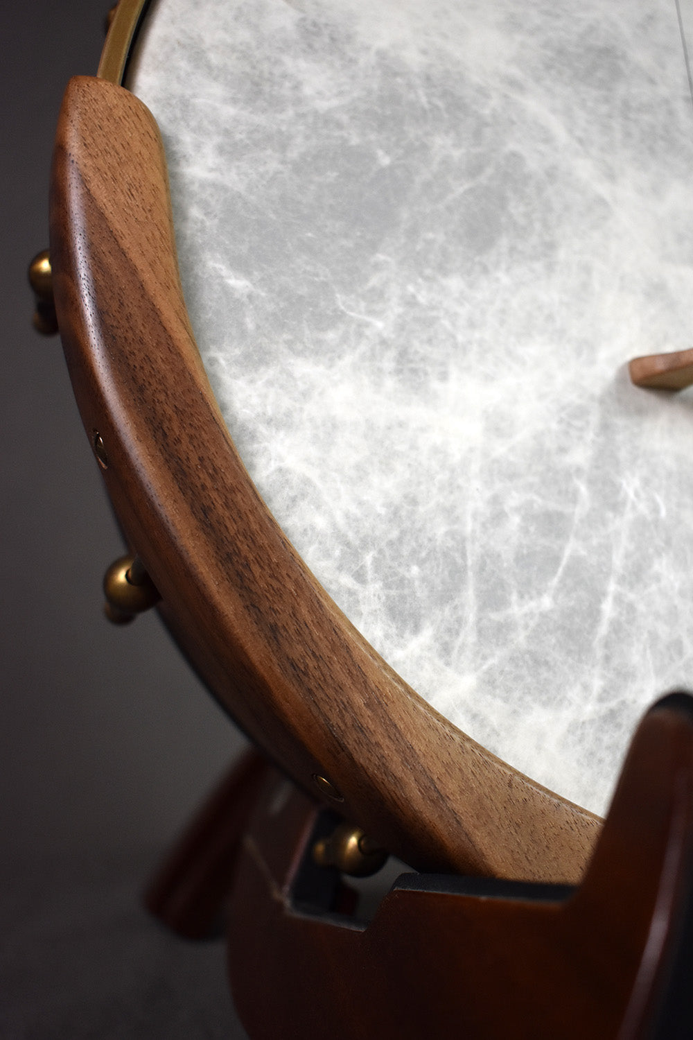 We ordered this Tupelo with a hand-carved Mahogany neck that a smooth tung oil finish for comfort and understated elegance. It has an ebony fingerboard with 17 hardened nickel frets, brass dot inlays, and a scoop to facility old-time and clawhammer styles. The paddle-style headstock with ebony tuner buttons and Rickard Cyclone tuners adds a touch of refined craftsmanship, echoing the banjo’s timeless aesthetic.