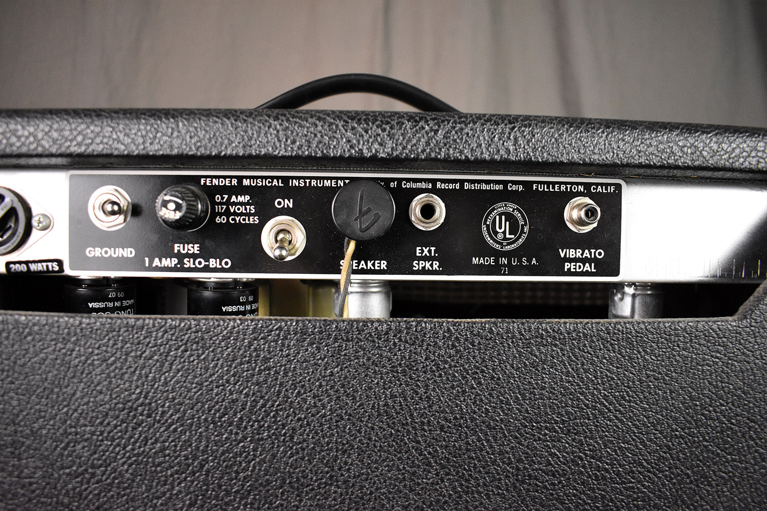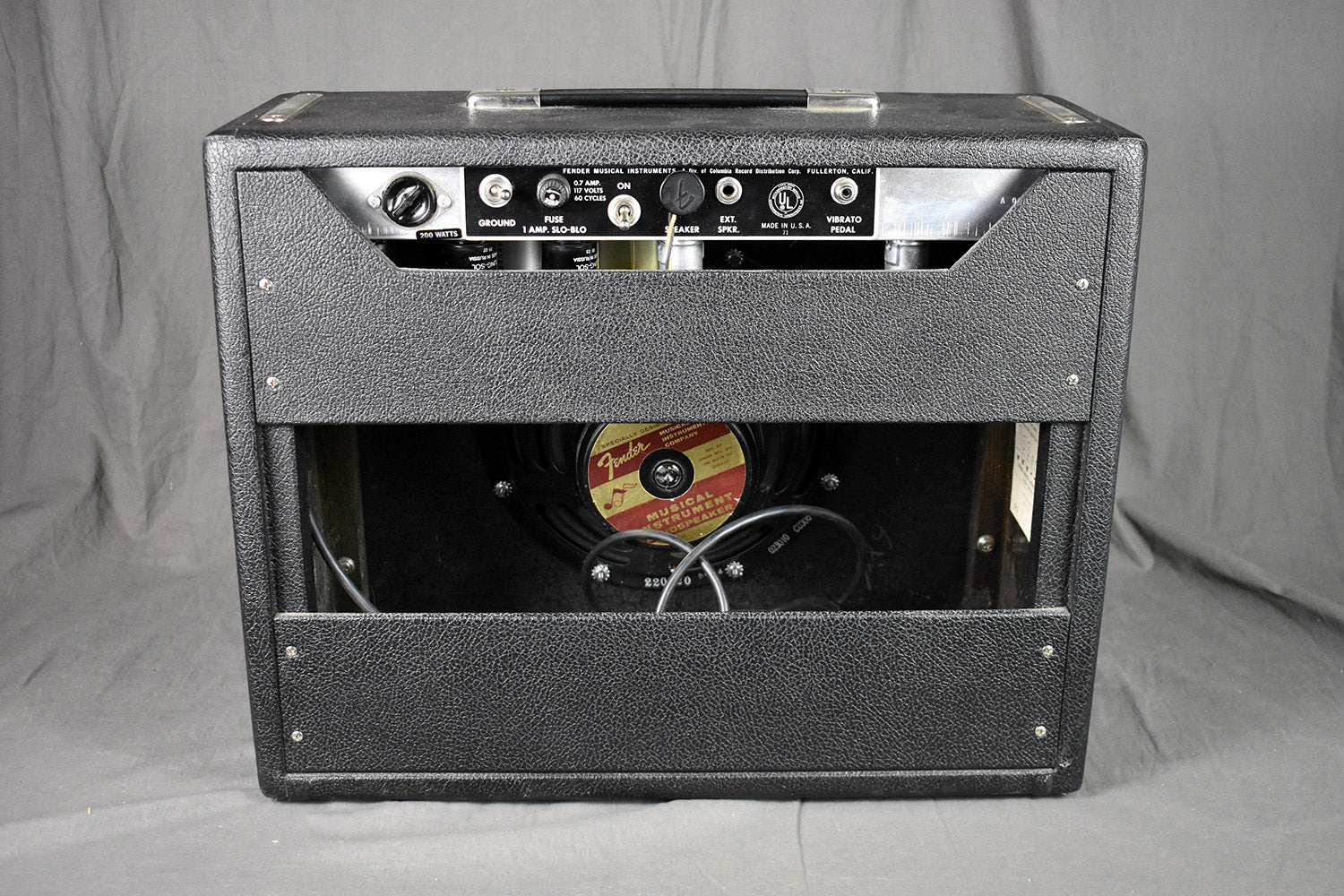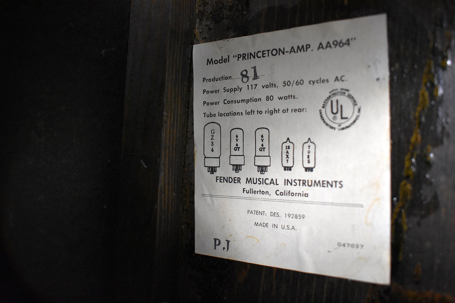 The black panel non-reverb Princeton is a simple, hand-wired circuit with a 7025 and a 12AX7 in the preamp, two 6V6GT power tubes, and a GZ34 rectifier. The circuit delivers about 12 watts through a single 10″ speaker, and there are controls for volume, treble, bass, Tremolo intensity, and Tremolo speed. Unlike the Reverb counterpart, the Princeton circuit omits the extra gain stage and spring reverb tank, yielding exceptionally clear, focused tone with slightly lower output.