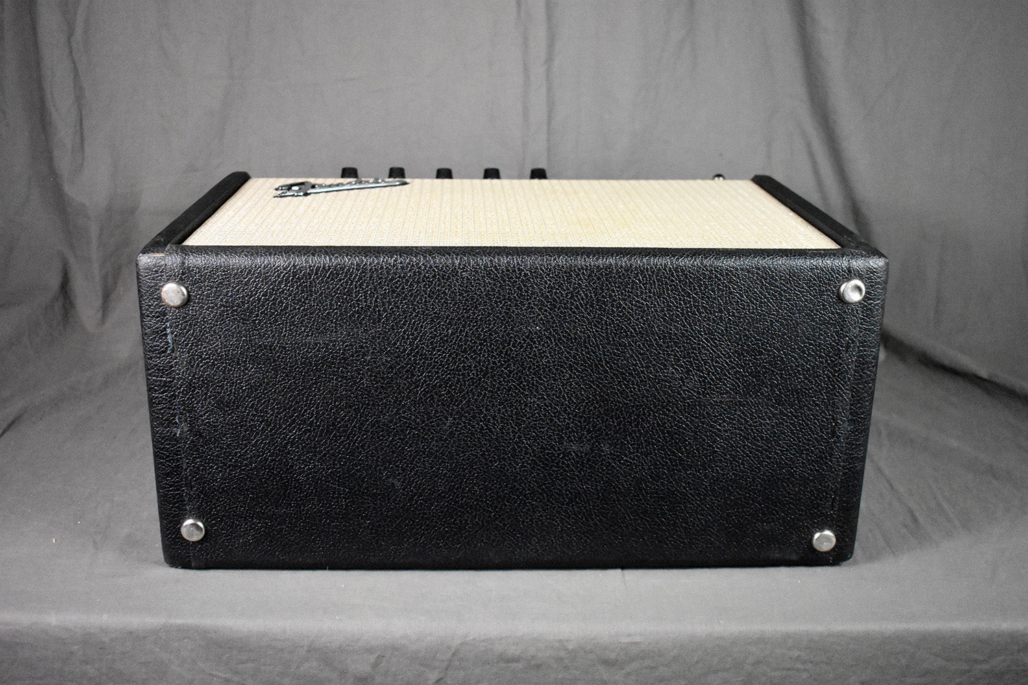 While a lot of Princeton Reverbs sound good right around 5-6 on the volume control, this 1966 Fender Princeton shines right around 8-9. At that level, the tubes are rolling, and the tone is nicely saturated with some natural tube compression. There's an immediacy to the dynamic response that stands out relative to other Fender black panel models. It captures a smoother, warmer sound, too. This 1966 Princeton would serve as a studio workhorse with articulate clean tones and smooth breakup, but would also be a classic low-wattage stage amp that takes pedals exceptionally well. It includes a custom-made leather cover.