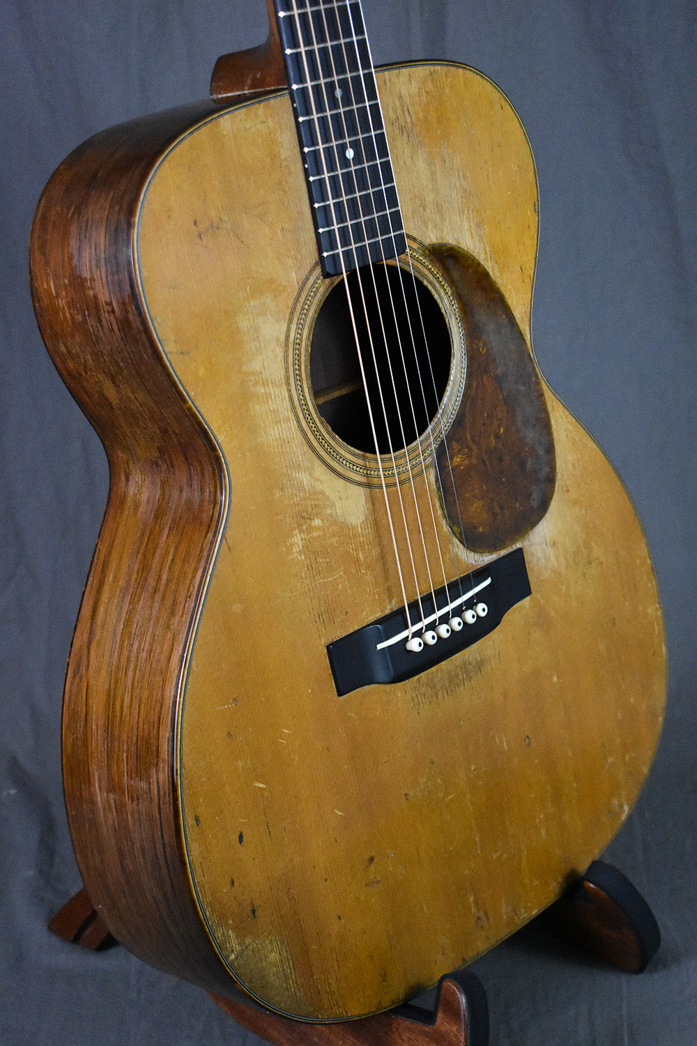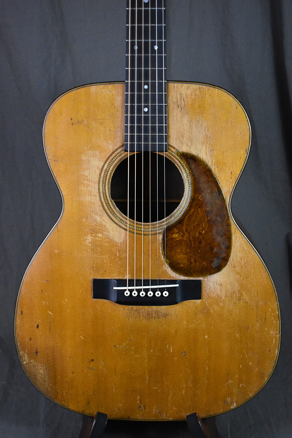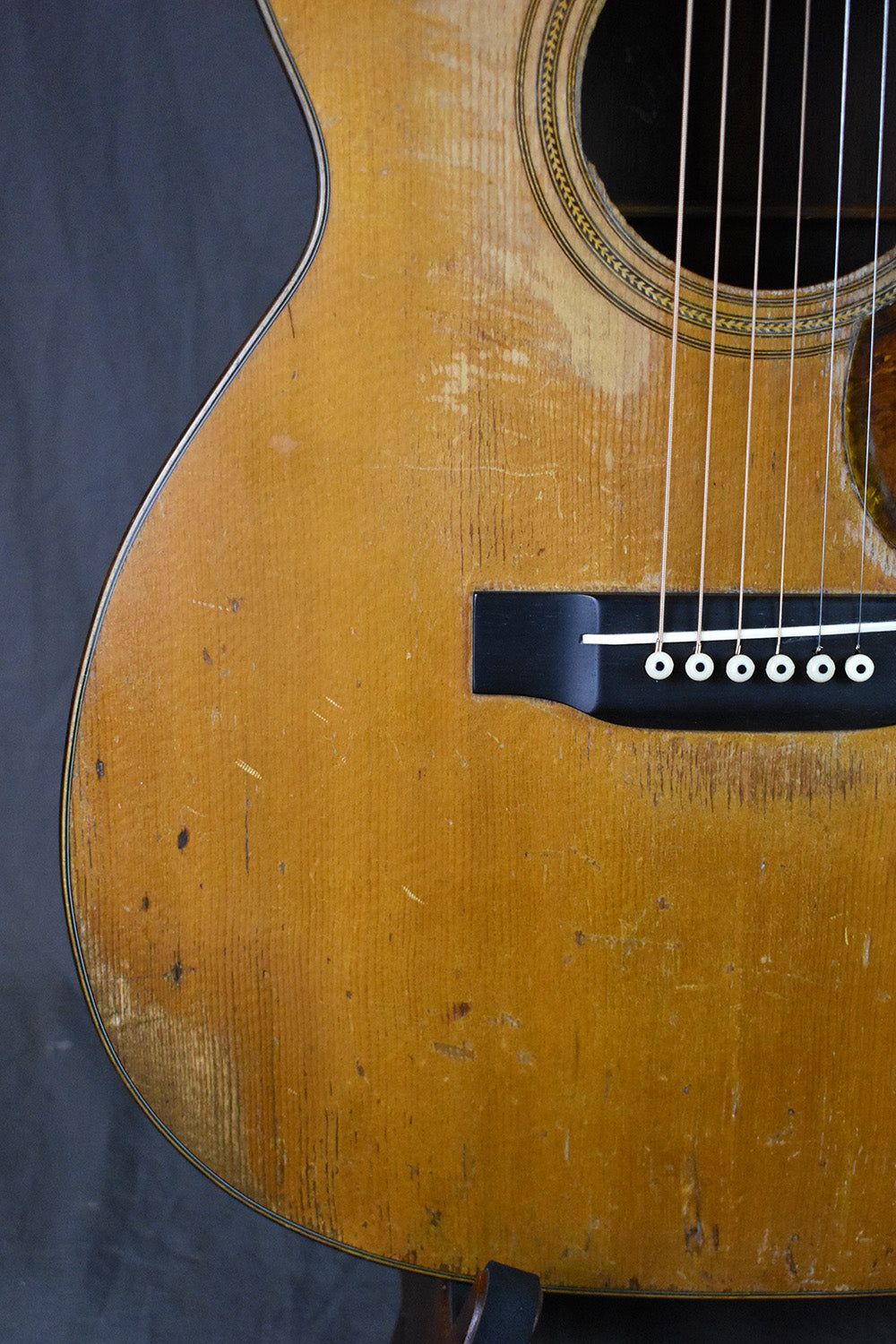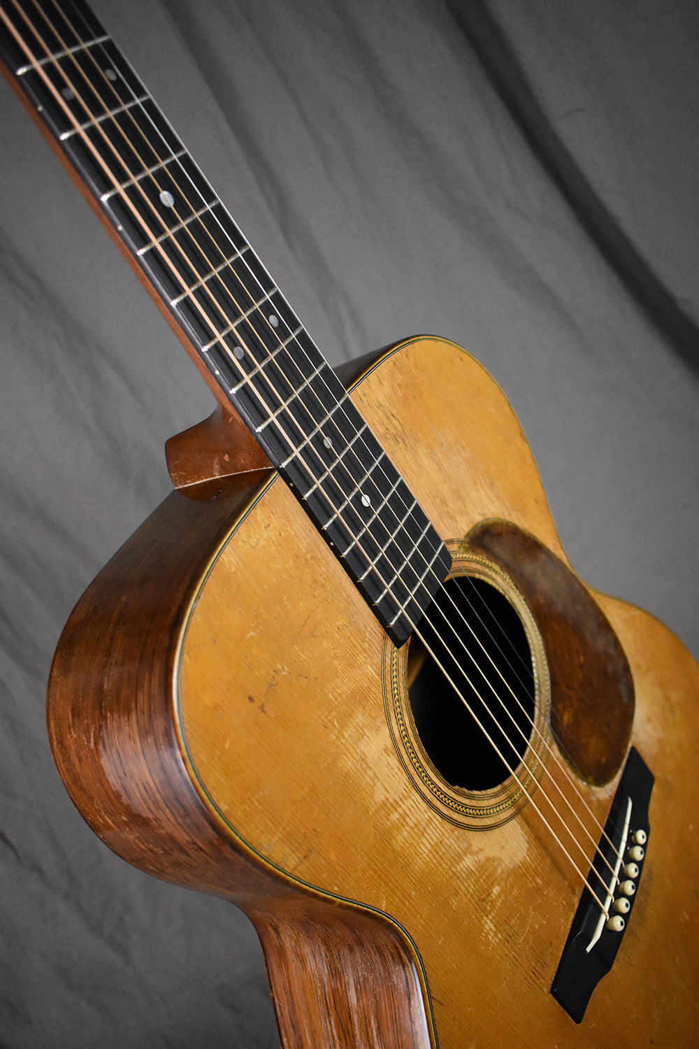 As soon as you open the case, this 1945 000-21 oozes with vibe and the authentic mojo of well-loved vintage guitar. What's obvious is that someone played it. A lot. The good ones get played, and someone loved this one enough to put it through the paces time and again. There is wear all around the soundhole and pickguard area, and in fact part of the bass edge of soundhole is partially worn toward the rosette. All around the body, the finish is worn through, checked, and patina-ed, and most of the finish is completely worn off of the back of the neck, which as a 1-11/16" nut width and comfortable soft V profile. This is a real relic, but it has so much left in the tank!