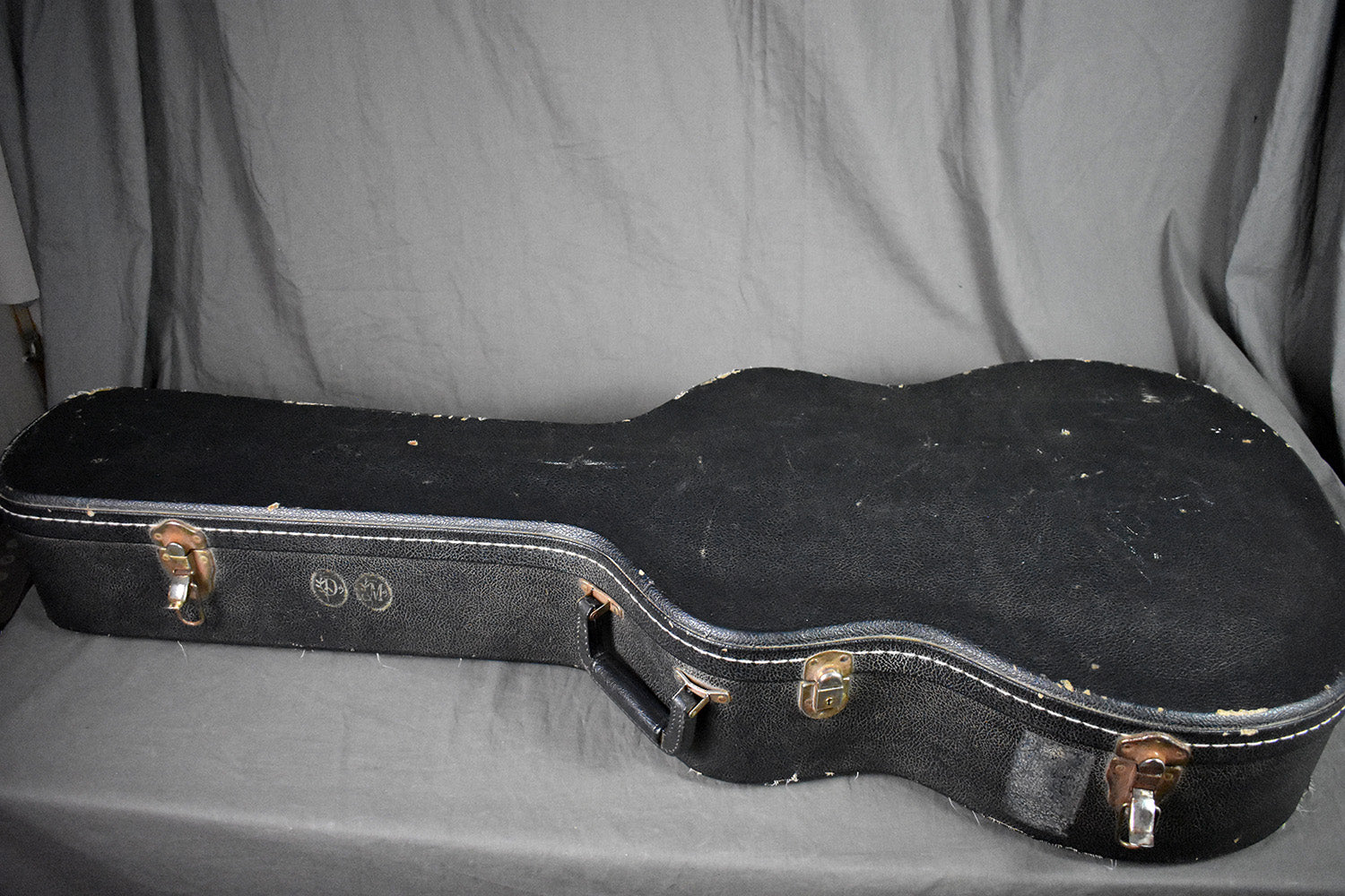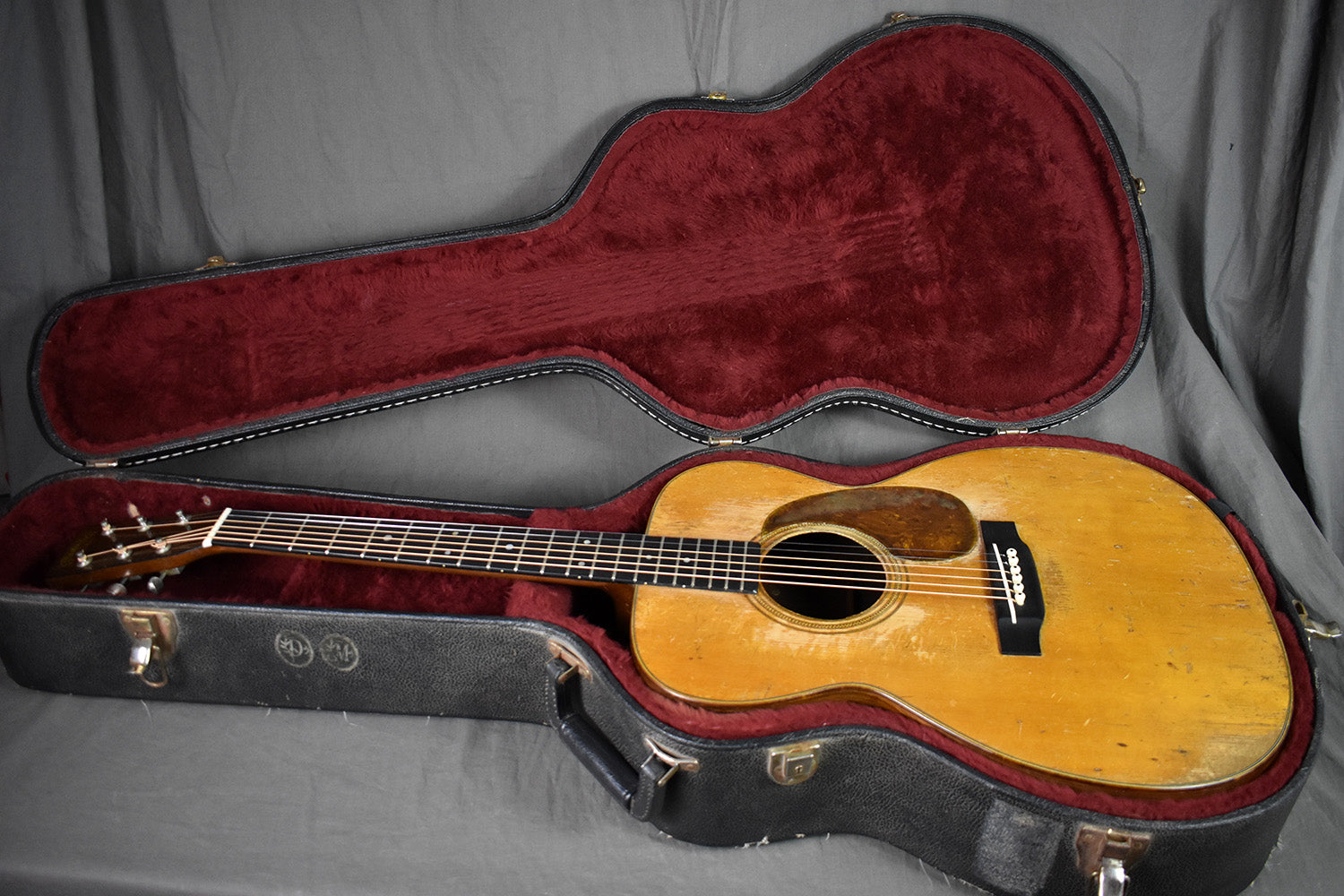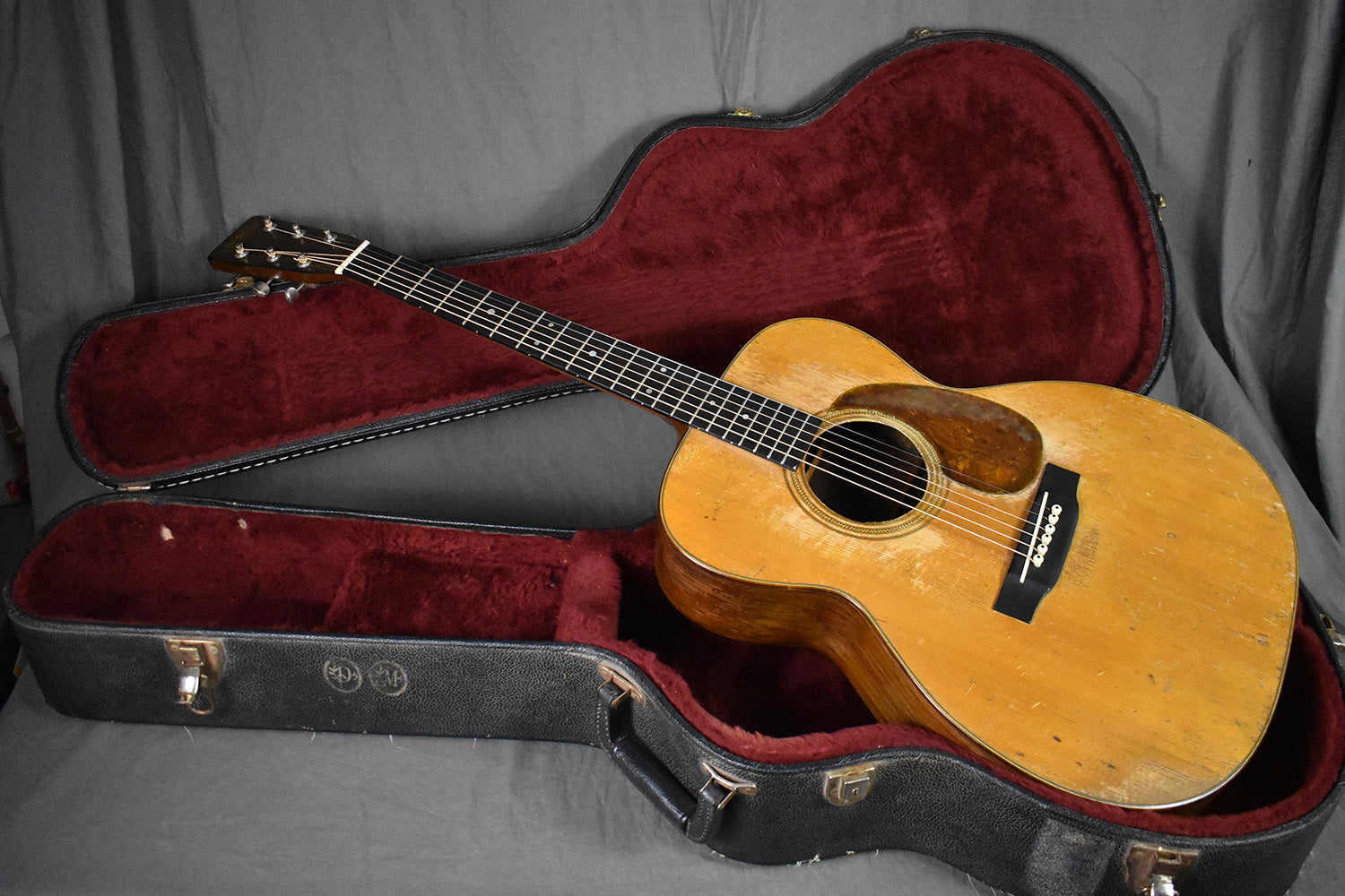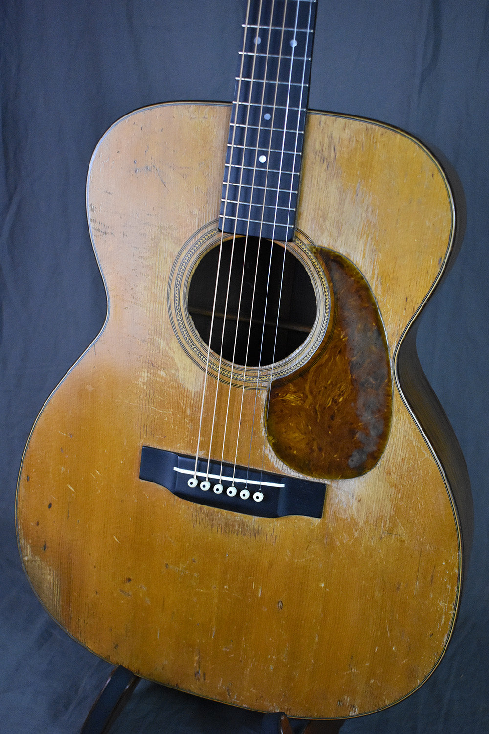 As soon as you open the case, this 1945 000-21 oozes with vibe and the authentic mojo of well-loved vintage guitar. What's obvious is that someone played it. A lot. The good ones get played, and someone loved this one enough to put it through the paces time and again. There is wear all around the soundhole and pickguard area, and in fact part of the bass edge of soundhole is partially worn toward the rosette. All around the body, the finish is worn through, checked, and patina-ed, and most of the finish is completely worn off of the back of the neck, which as a 1-11/16" nut width and comfortable soft V profile. This is a real relic, but it has so much left in the tank!