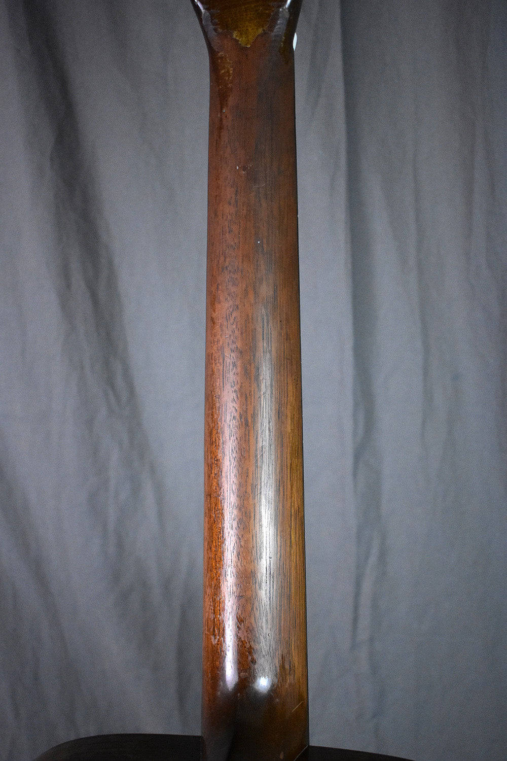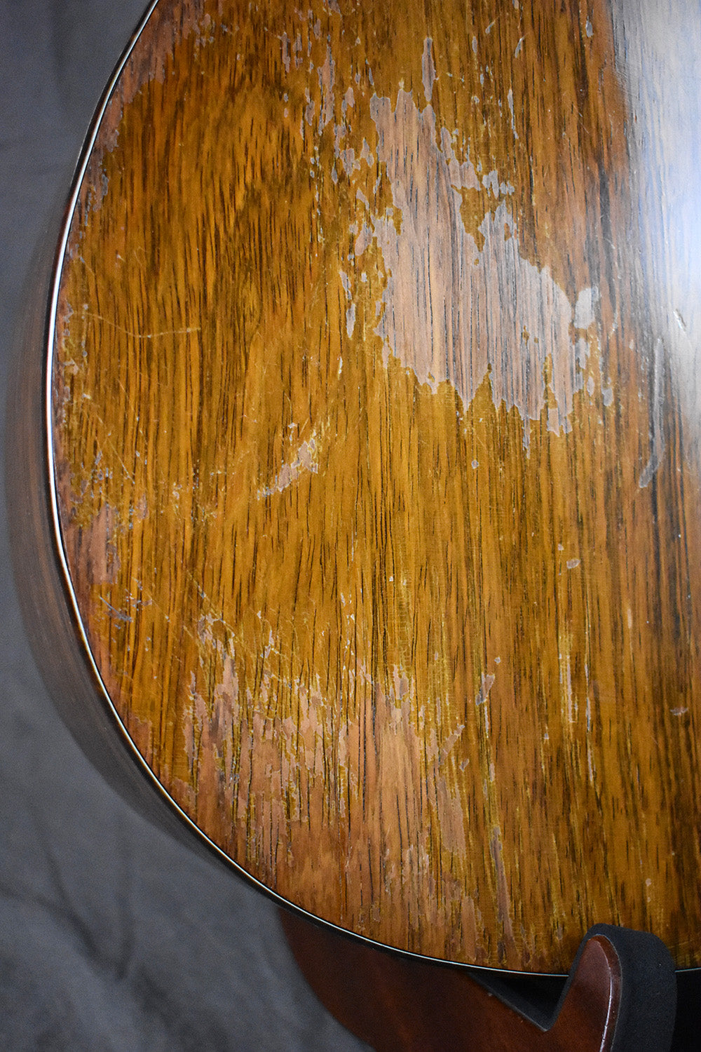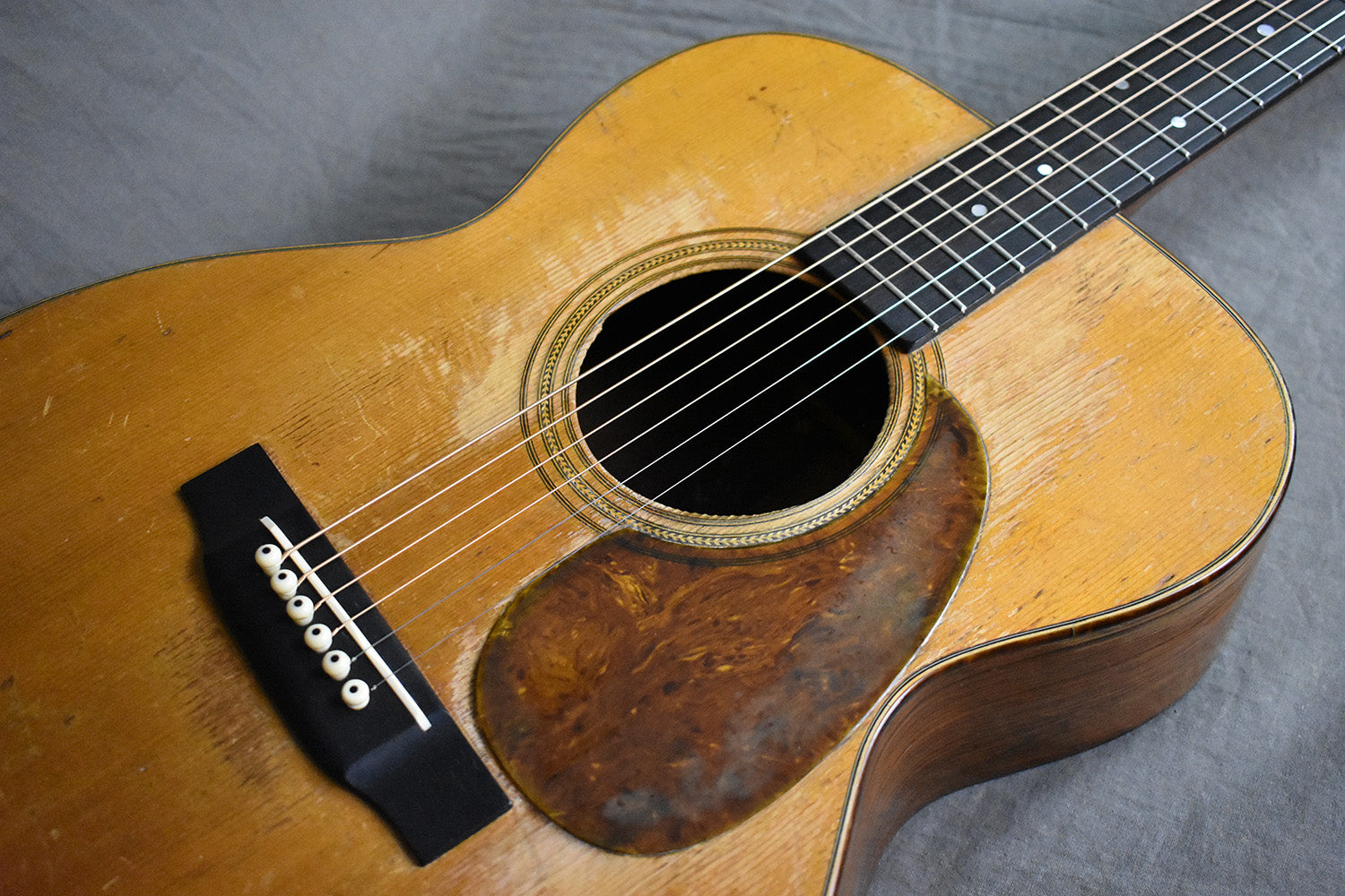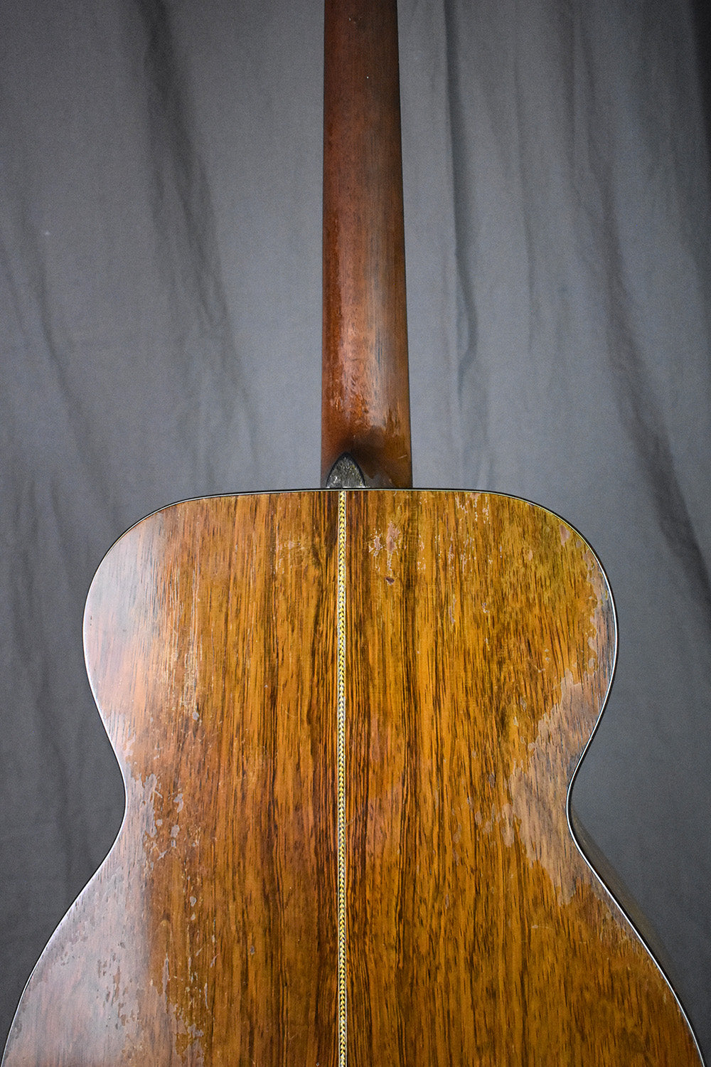 For the last few decades, Jon Eaton at Woodsongs Lutherie (Boulder, Colorado) has looked after this guitar. Thanks to Jon's careful eye, it finds us with low, approachable action and smooth fretwork. The neck has been reset, and the bridge is a replacement. The saddle is sitting on the low side, so the neck angle may need to be adjusted to lower the action in the future. But at this present moment, the guitar plays just as nicely as a brand new Martin from the factory. It has replacement closed-back Kluson tuners that keep the tuning stable, and the nut has been replaced. From there, past structural repairs include two repaired back cracks and two repaired cracks on the treble side. There is a filled strap button hole on the bass side and another one on the neck heel. The bridge plate is the original small-size, and there are various signs of bracing reglues on the inside of the body, including some gobs of glue around the bridge area and underneath the pickguard.