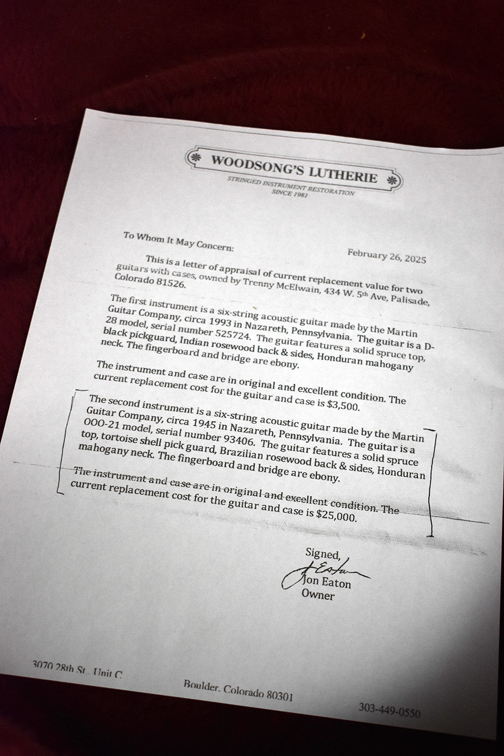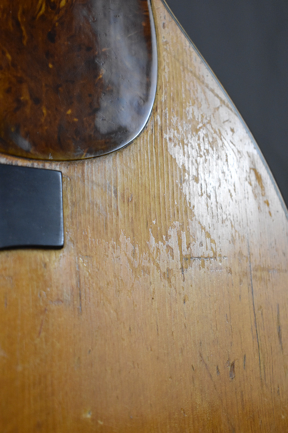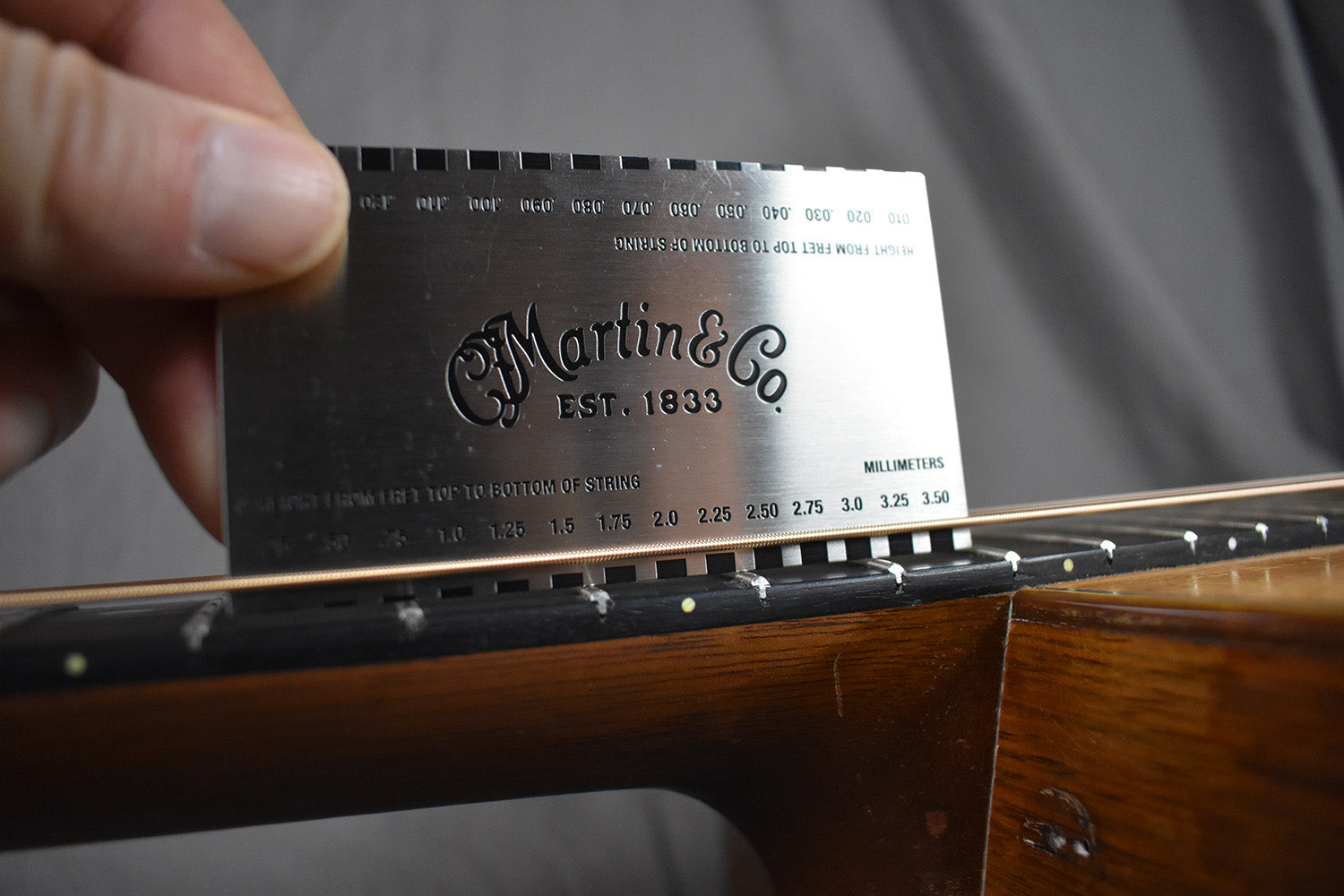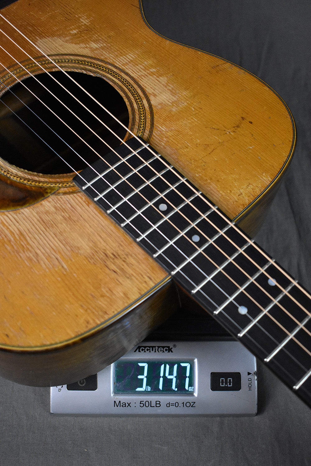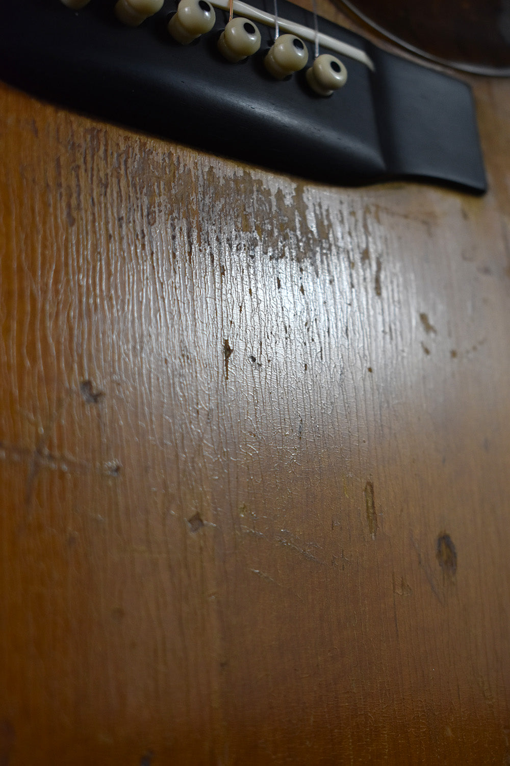 For the last few decades, Jon Eaton at Woodsongs Lutherie (Boulder, Colorado) has looked after this guitar. Thanks to Jon's careful eye, it finds us with low, approachable action and smooth fretwork. The neck has been reset, and the bridge is a replacement. The saddle is sitting on the low side, so the neck angle may need to be adjusted to lower the action in the future. But at this present moment, the guitar plays just as nicely as a brand new Martin from the factory. It has replacement closed-back Kluson tuners that keep the tuning stable, and the nut has been replaced. From there, past structural repairs include two repaired back cracks and two repaired cracks on the treble side. There is a filled strap button hole on the bass side and another one on the neck heel. The bridge plate is the original small-size, and there are various signs of bracing reglues on the inside of the body, including some gobs of glue around the bridge area and underneath the pickguard.