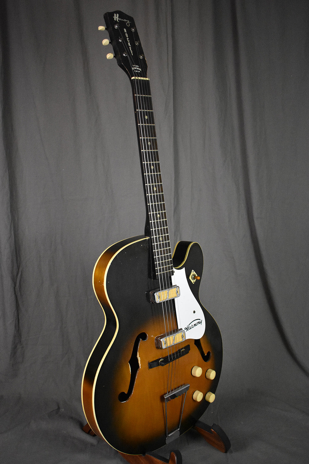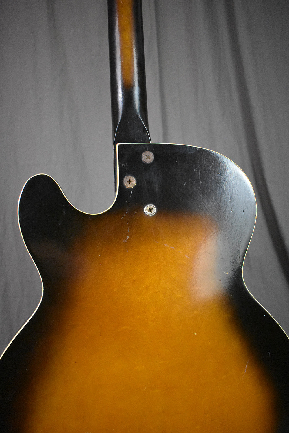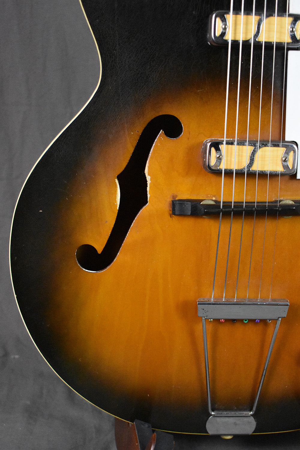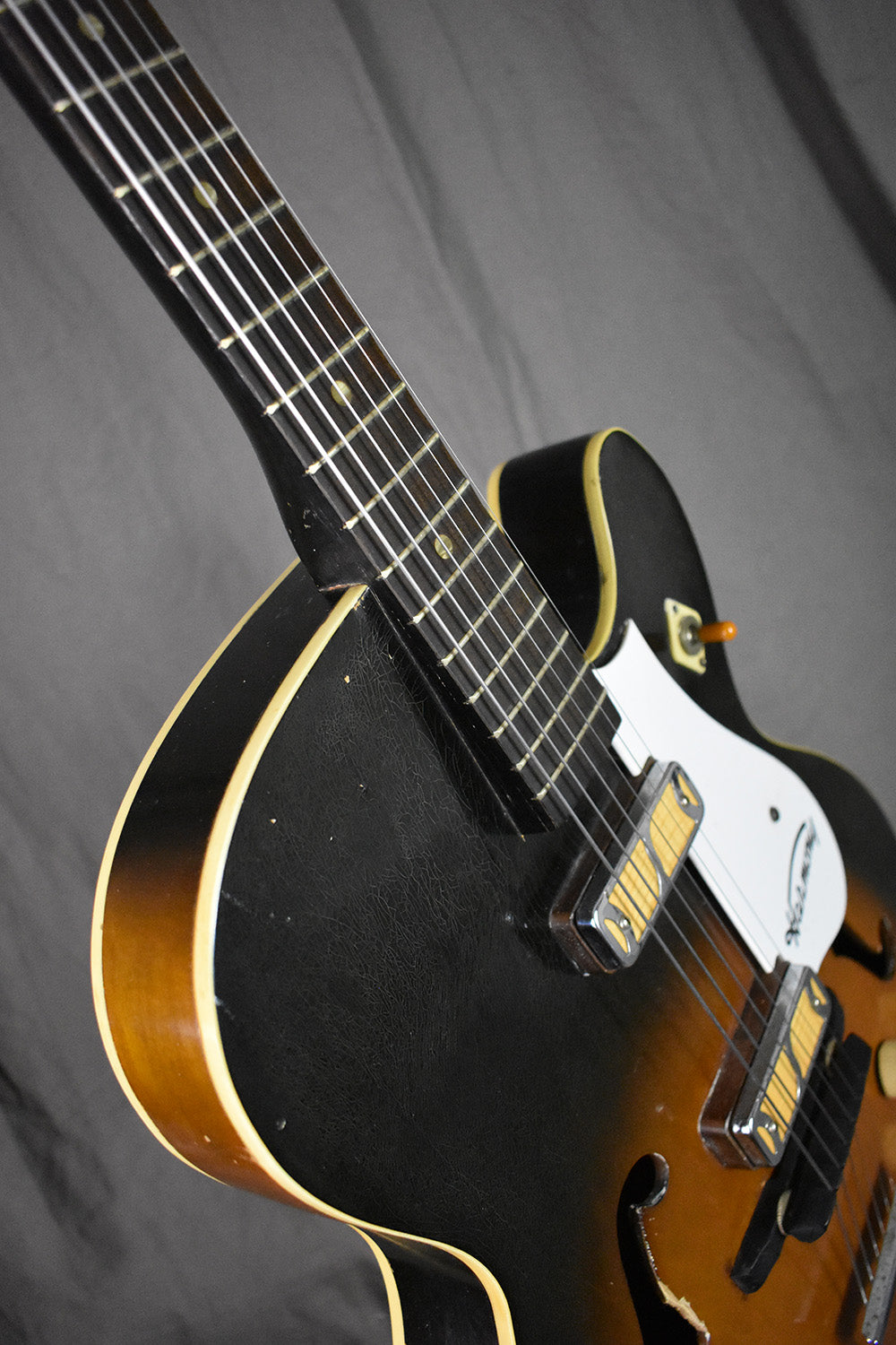 This 1959 H54 Rocket features a single-cutaway, fully-hollow body that measures just shy of 2" at the side. Outfitted with two DeArmond gold-foil pickups, this Rocket produces clear, slightly gritty tone with the wide acoustic resonance and dynamic response of a proper archtop. The sunburst finish is complemented by cream “Cupcake” knobs—a signature Harmony detail. This Rocket retains its original electronics, original floating bridge, original trapeze tailpiece, original tuning machines, and original pickguard. These elements lend an authentic vintage vibe, but fortunately they still keep the guitar functional and usable for a modern player.