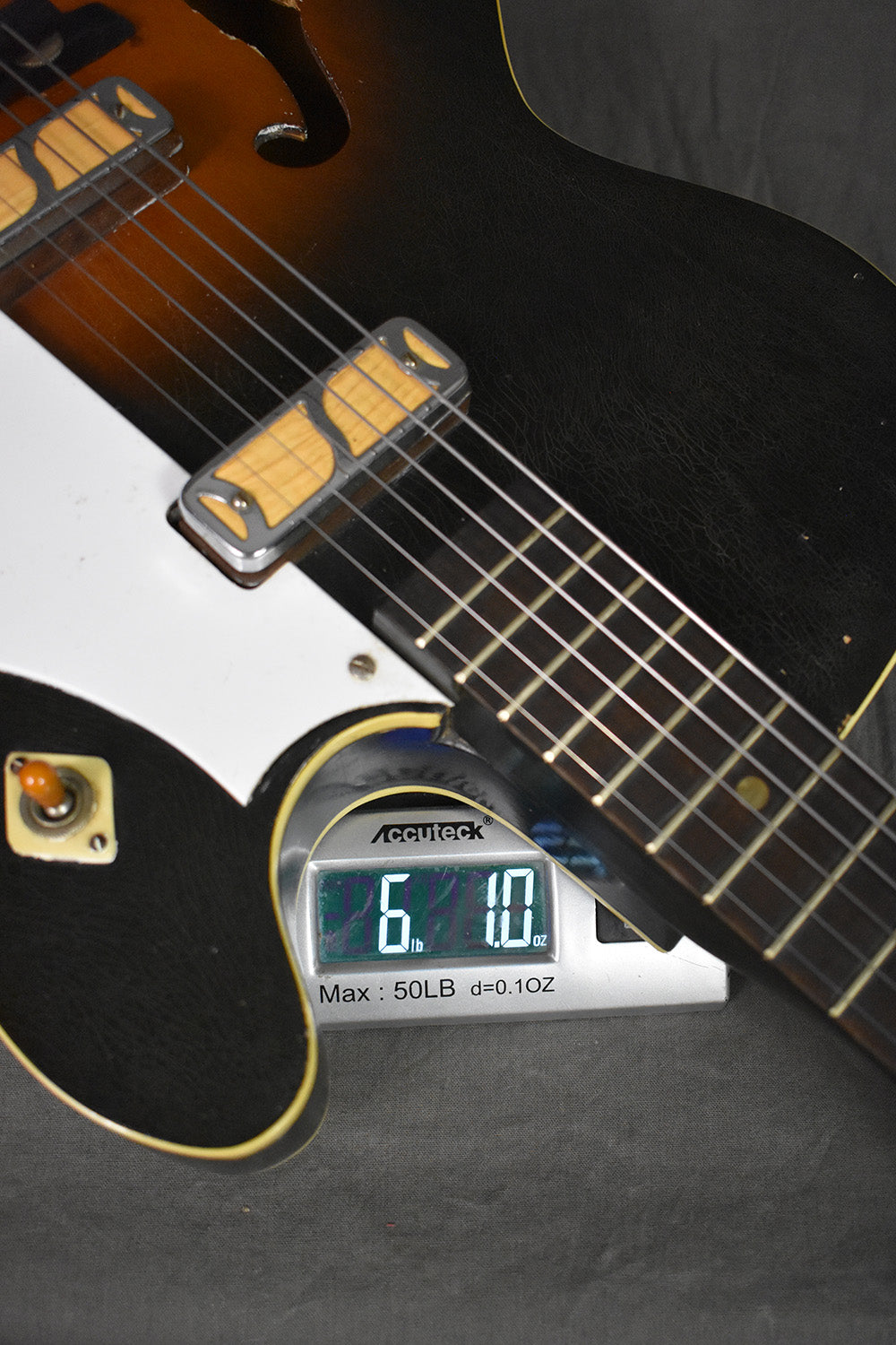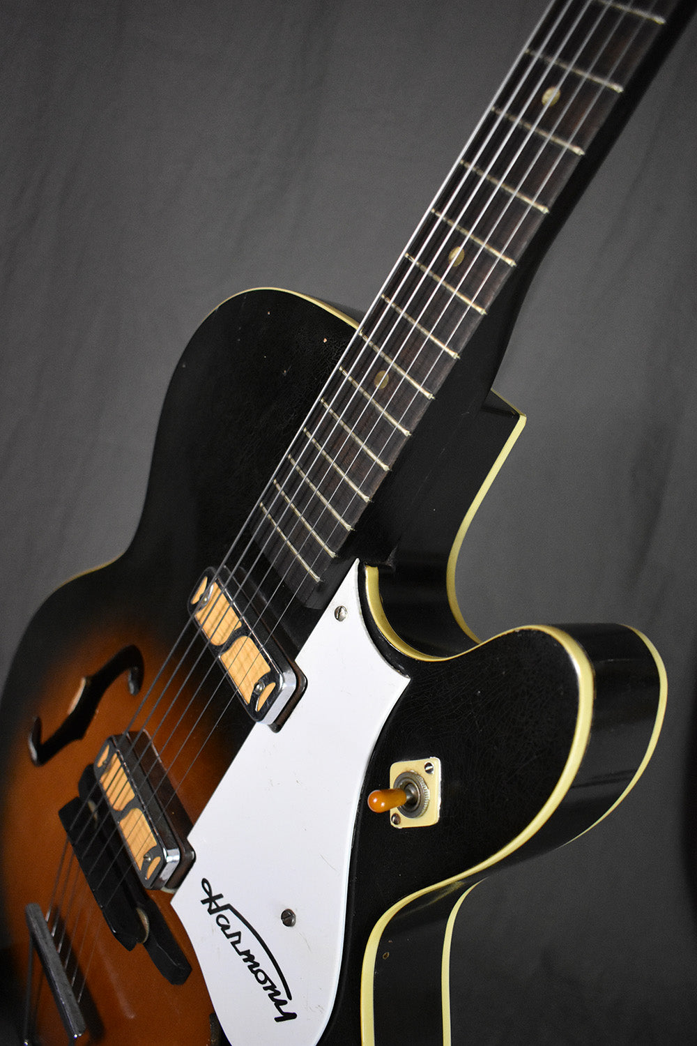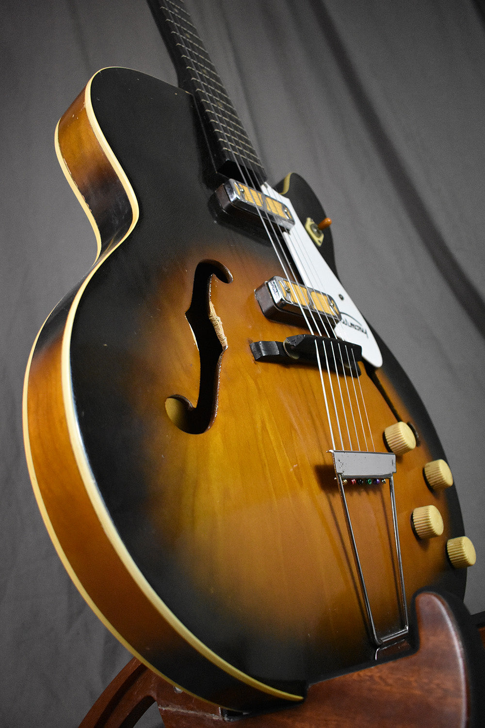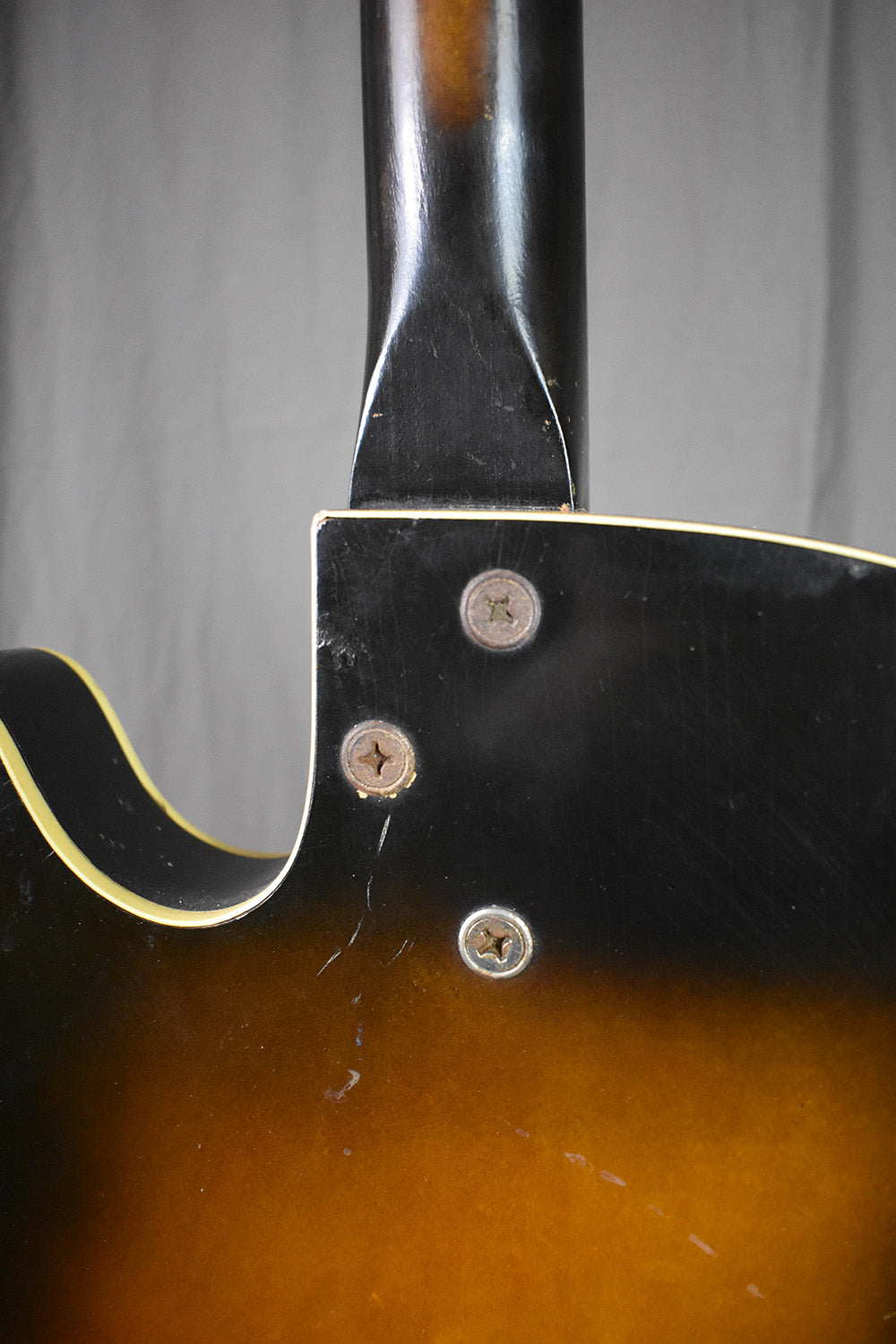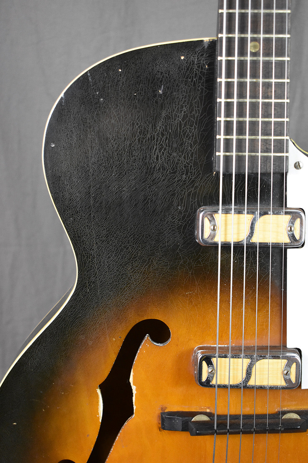 This 1959 H54 Rocket features a single-cutaway, fully-hollow body that measures just shy of 2" at the side. Outfitted with two DeArmond gold-foil pickups, this Rocket produces clear, slightly gritty tone with the wide acoustic resonance and dynamic response of a proper archtop. The sunburst finish is complemented by cream “Cupcake” knobs—a signature Harmony detail. This Rocket retains its original electronics, original floating bridge, original trapeze tailpiece, original tuning machines, and original pickguard. These elements lend an authentic vintage vibe, but fortunately they still keep the guitar functional and usable for a modern player.