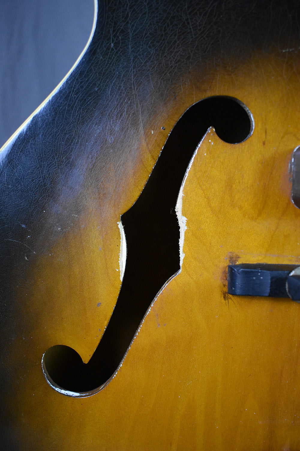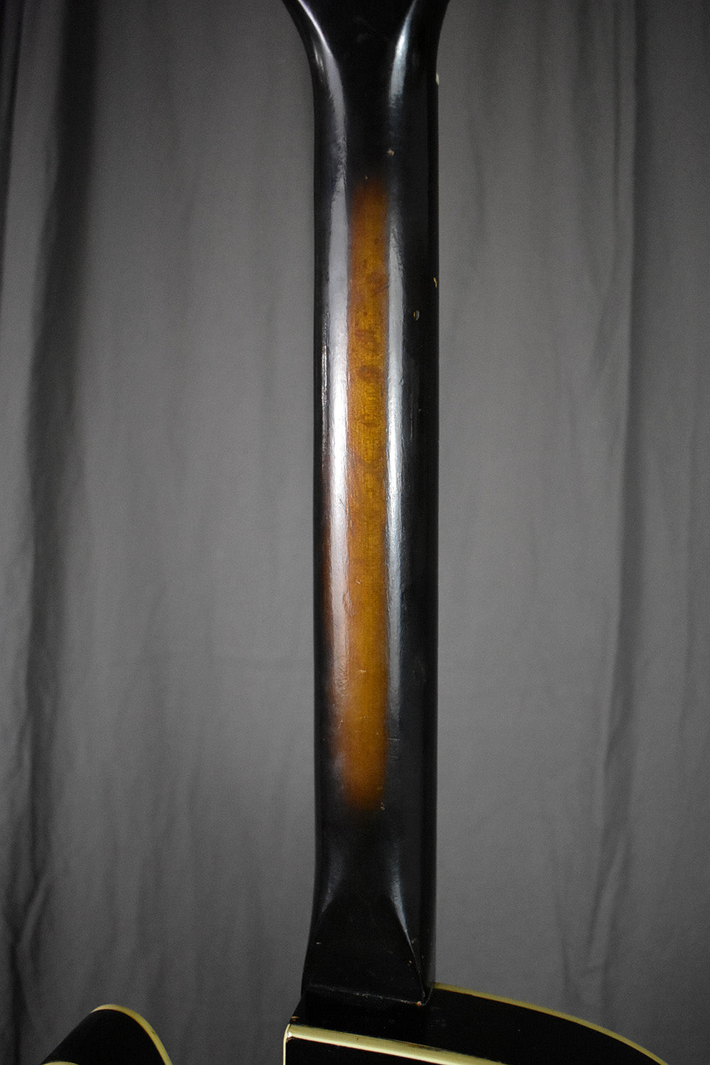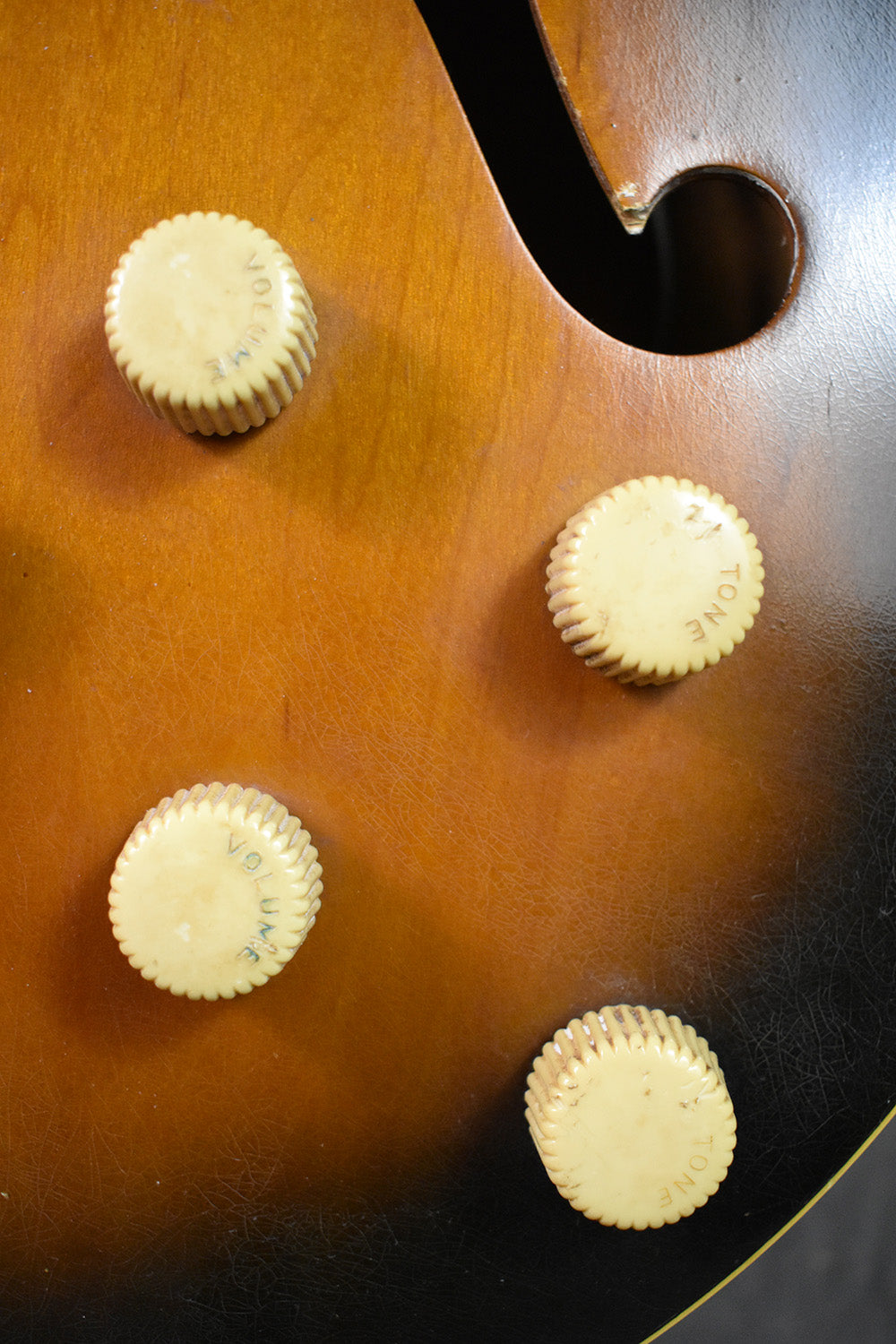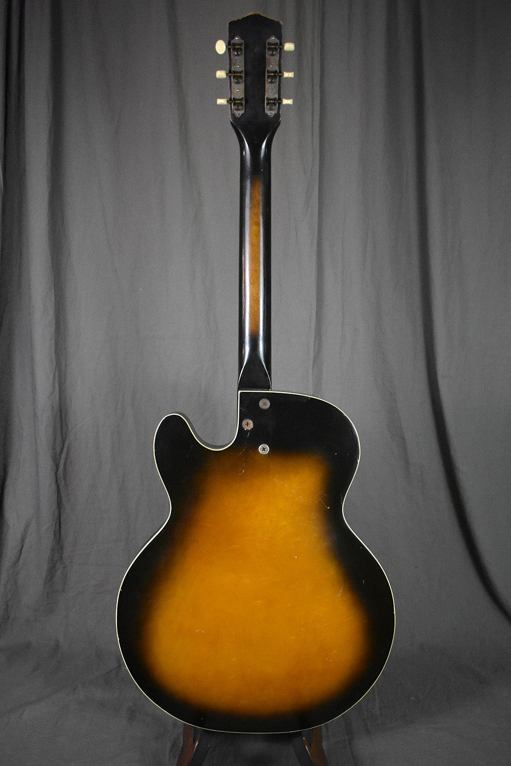This 1959 H54 Rocket features a single-cutaway, fully-hollow body that measures just shy of 2" at the side. Outfitted with two DeArmond gold-foil pickups, this Rocket produces clear, slightly gritty tone with the wide acoustic resonance and dynamic response of a proper archtop. The sunburst finish is complemented by cream “Cupcake” knobs—a signature Harmony detail. This Rocket retains its original electronics, original floating bridge, original trapeze tailpiece, original tuning machines, and original pickguard. These elements lend an authentic vintage vibe, but fortunately they still keep the guitar functional and usable for a modern player.