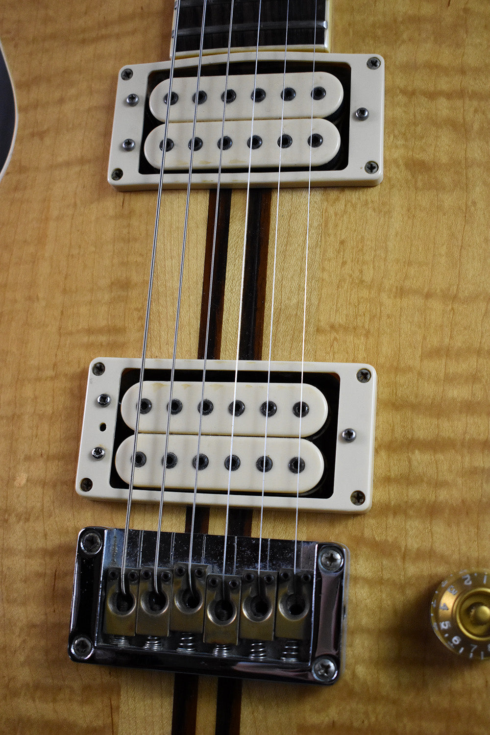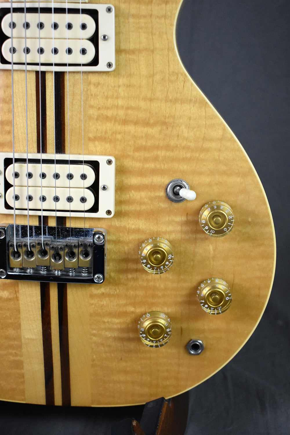 How many pieces of wood went into this guitar? The Flame Maple "wings" on the top iare stunning, and the Ash on the underside is dense, providing sustain and richness. The design was probably intended to appeal to hard rock players, but interestingly the Falcon delivers more versatility than similar guitars from the late '70s. In our shop, this guitar gives off serious Jerry Garcia vibes. With the right rig, this Falcon can cover some of the late-'70s Wolf sounds.