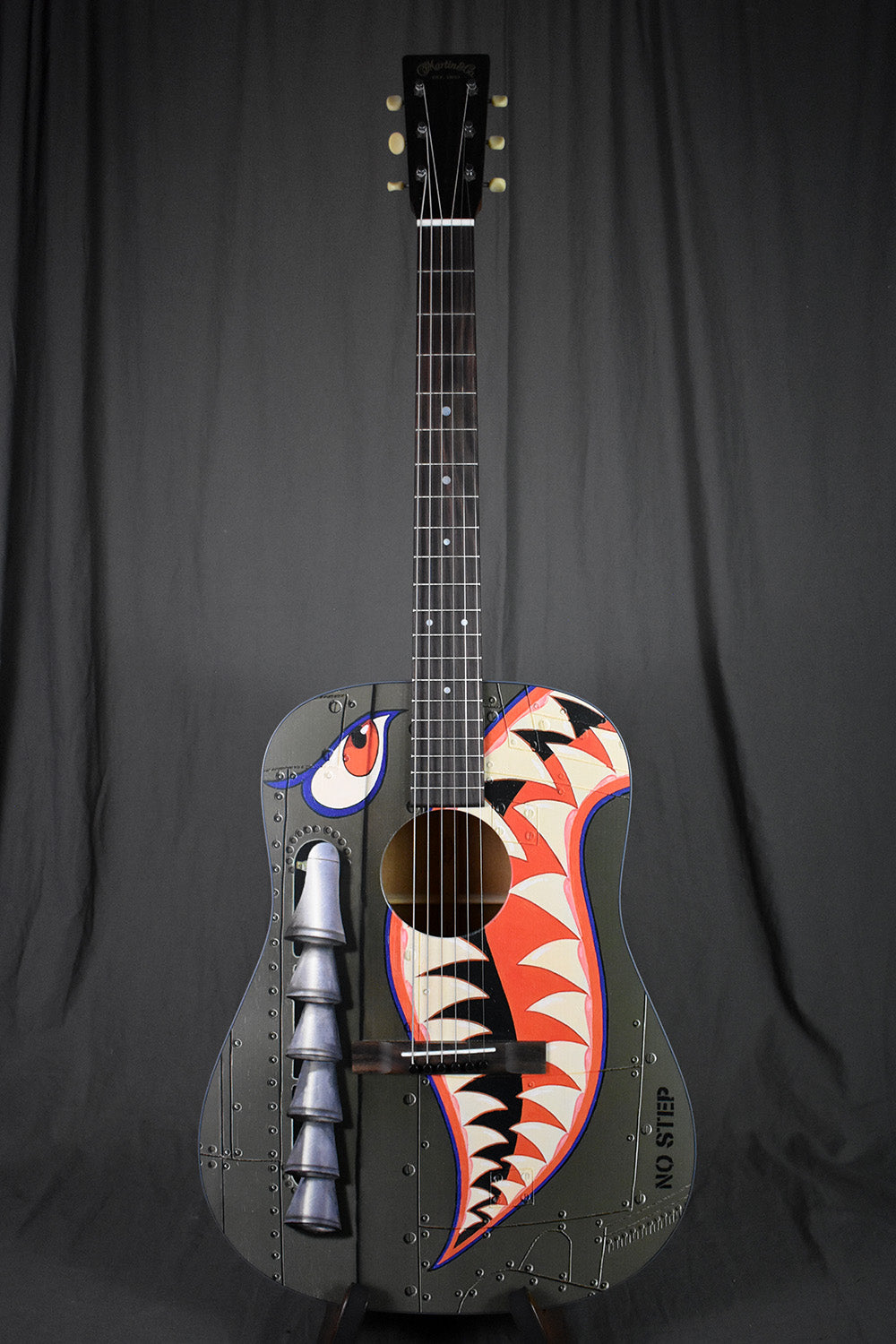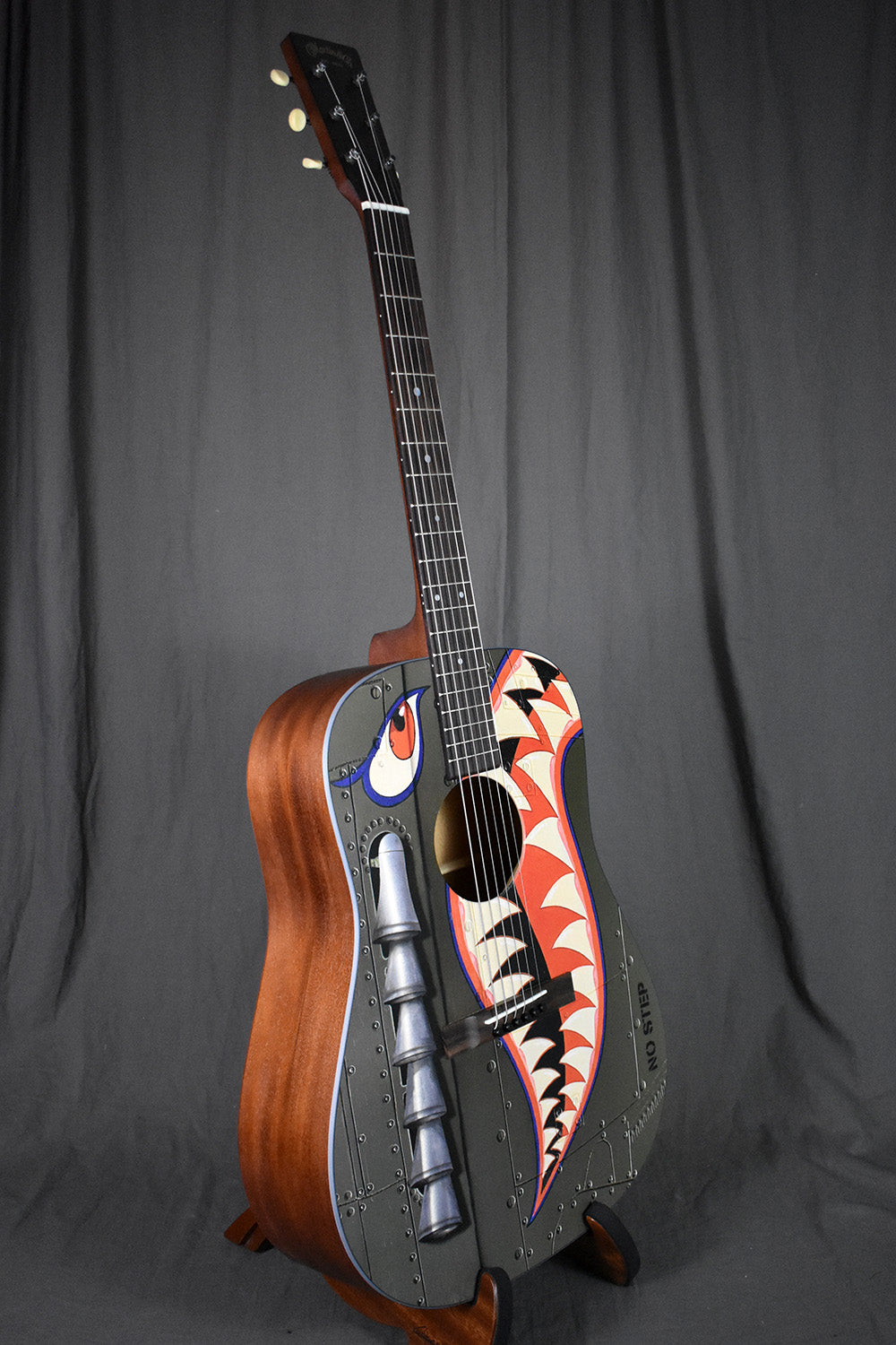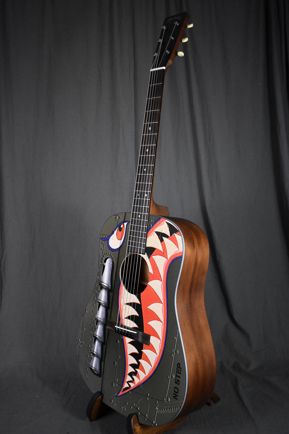 The D-17 Squadron commemorates the legendary American Volunteer Group. Known as "The Flying Tigers," the AVG were an elite group of pilots who flew P-40s in the Pacific theatre of World War II. Inspired by a painted shark mouth one pilot spotted in a newspaper, the toothy grin nose art on the Flying Tigers' planes is instantly recognizable, and Robert Goetzl's interpretation of it gives the D-17 Squadron a look and vibe unlike any other guitar.